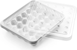 Практична пластмасова кутия за яйца с прозрачен капак за безопасно съхранение на до 30 броя. Идеална за хладилник и фризер, без BPA, лесна за почистване и с възможност за подреждане една върху друга. Благодарение на заключващия се капак предпазва яйцата от повреда, организира пространството в хладилника и позволява безопасен транспорт без нежелано изпадане.