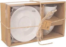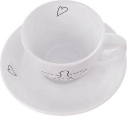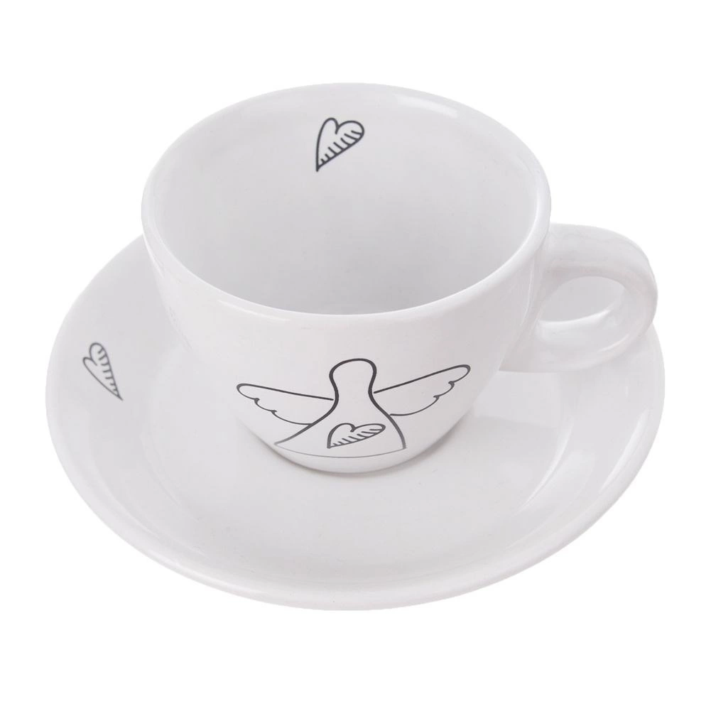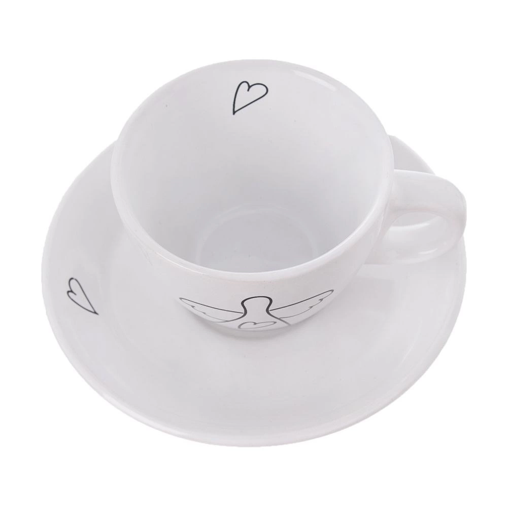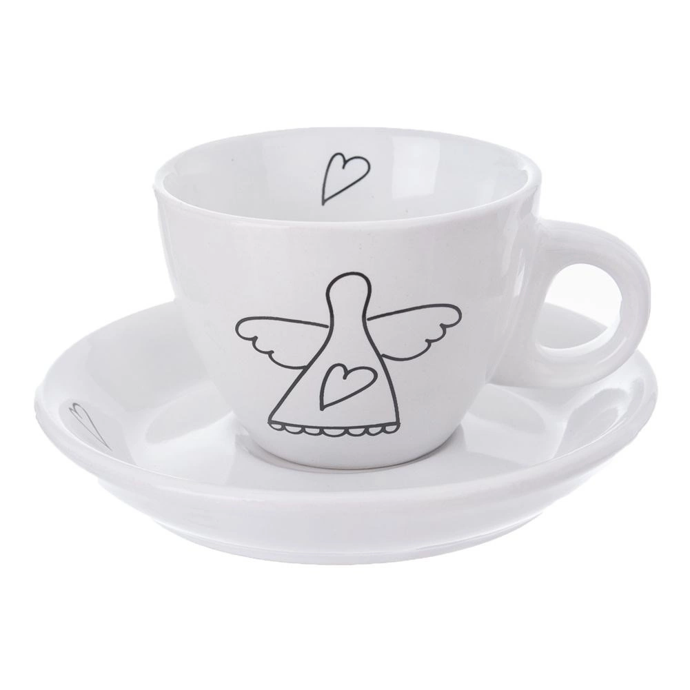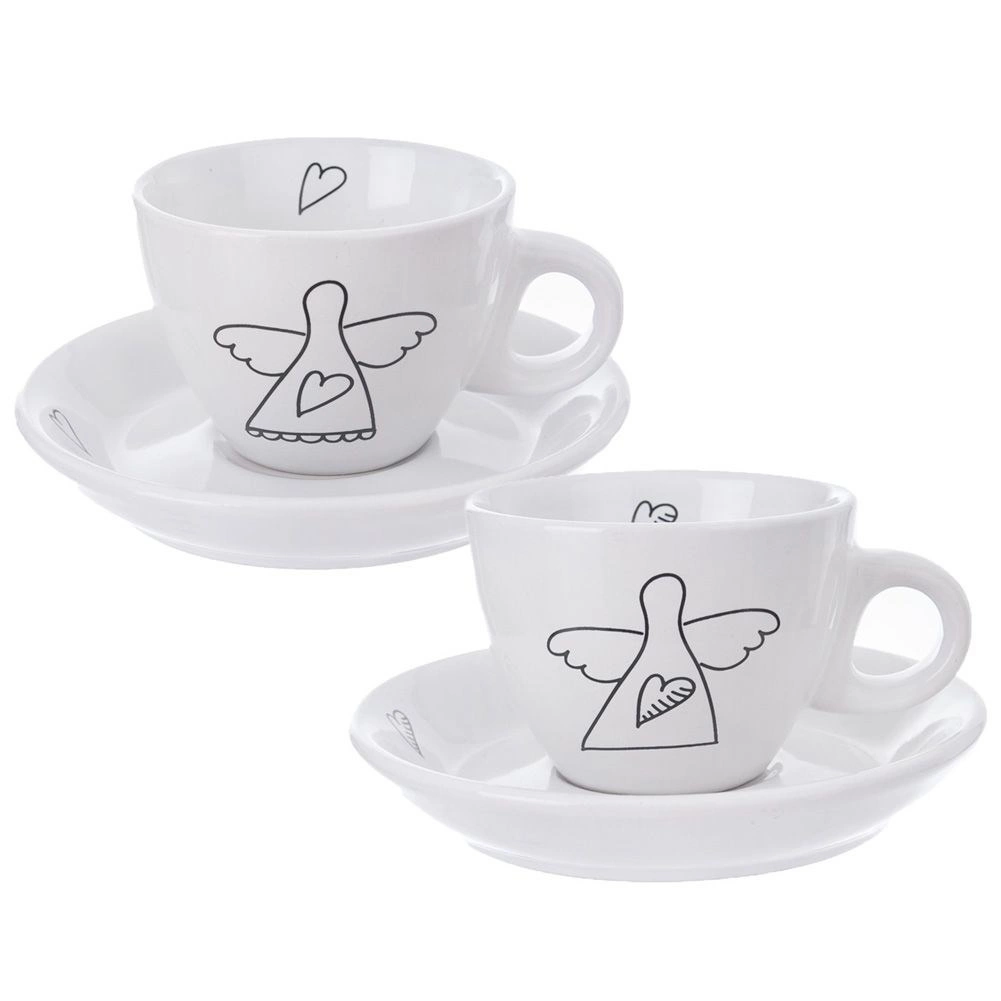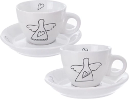 Елегантен комплект от две еспресо чашки с чинийки от качествена керамика в бял цвят с нежен мотив ангел и сърца. Идеални за еспресо 90 мл, подходящи за съдомиялна и микровълнова фурна, с удобна дръжка и подаръчна опаковка.