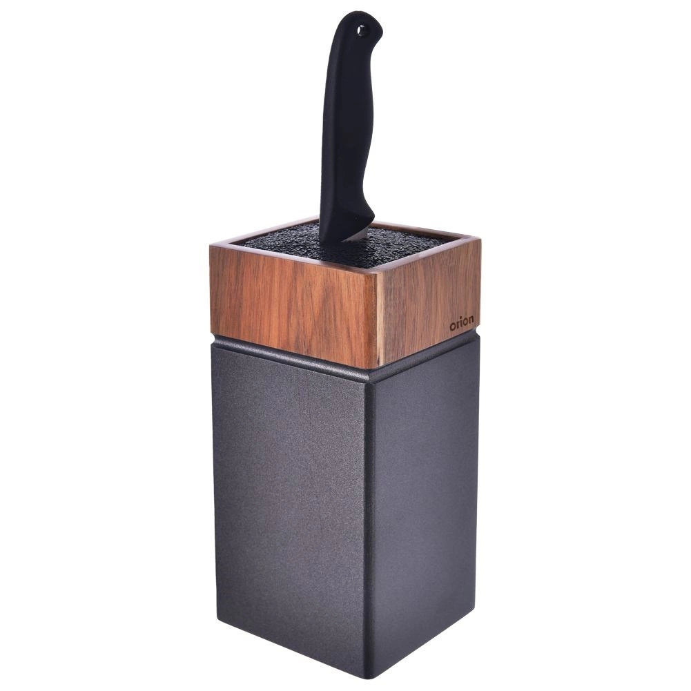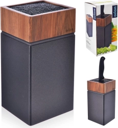Елегантна и практична поставка за ножове от акациево дърво и черна пластмаса, която надеждно съхранява вашите кухненски ножове и ножици. Благодарение на вътрешните подвижни влакна е универсална, щадяща острието и лесна за почистване. Подложки против плъзгане осигуряват стабилност, а модерната визия подхожда както на съвременни, така и на класически кухни.
