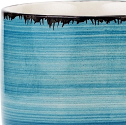 Универсалната керамична чаша от висококачествен камък съчетава практичност и модерен външен вид. Синьо‑бежовото глазиране с изразен райе декор и тъмен кант изглежда оригинално и лесно се комбинира с останалия сервиз. Обемът 355 ml е идеален за еспресо лунго, капучино, чай и горещ шоколад.