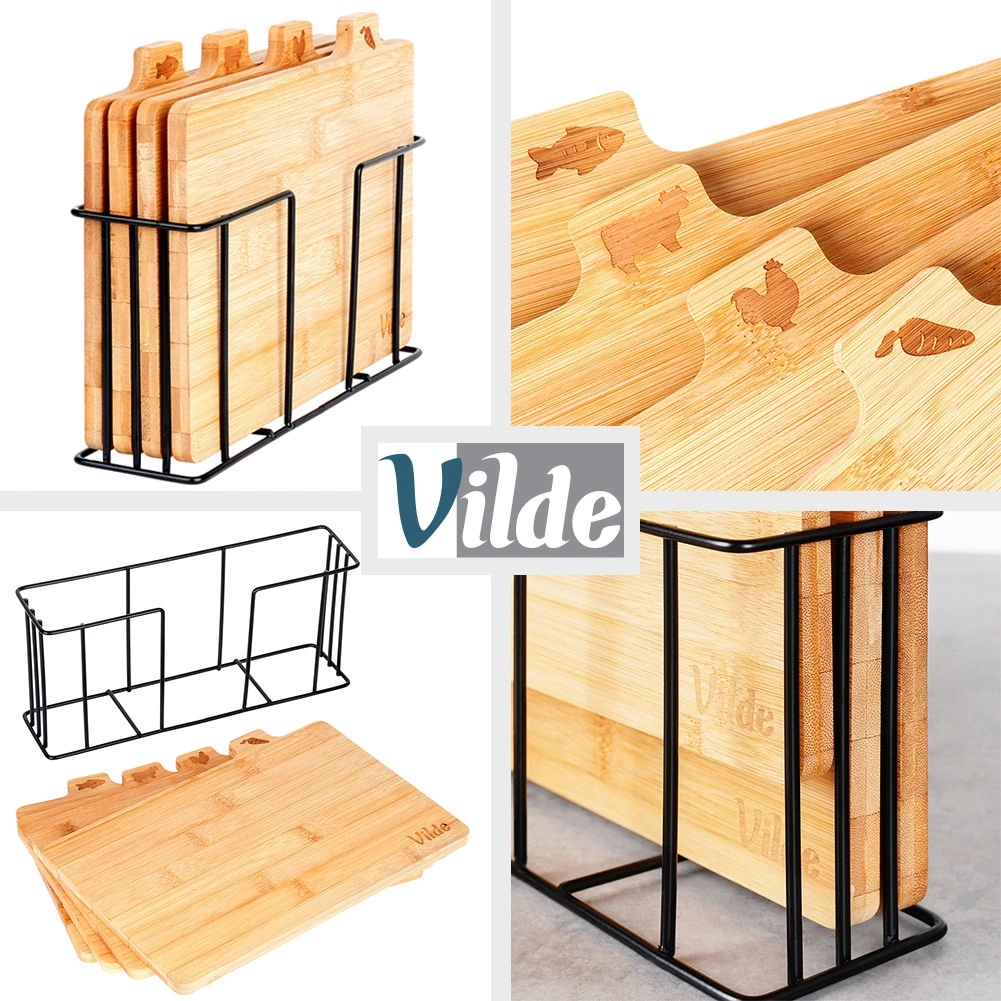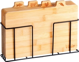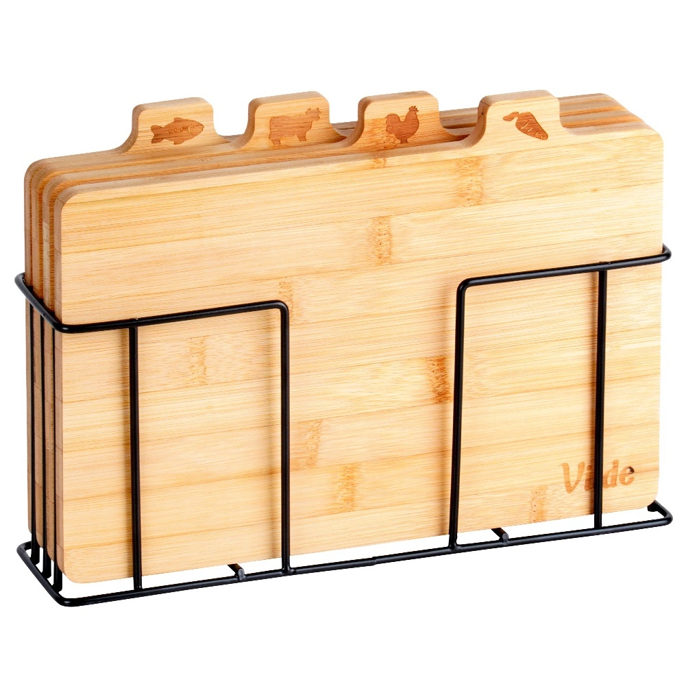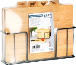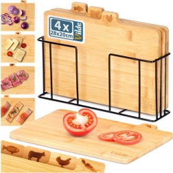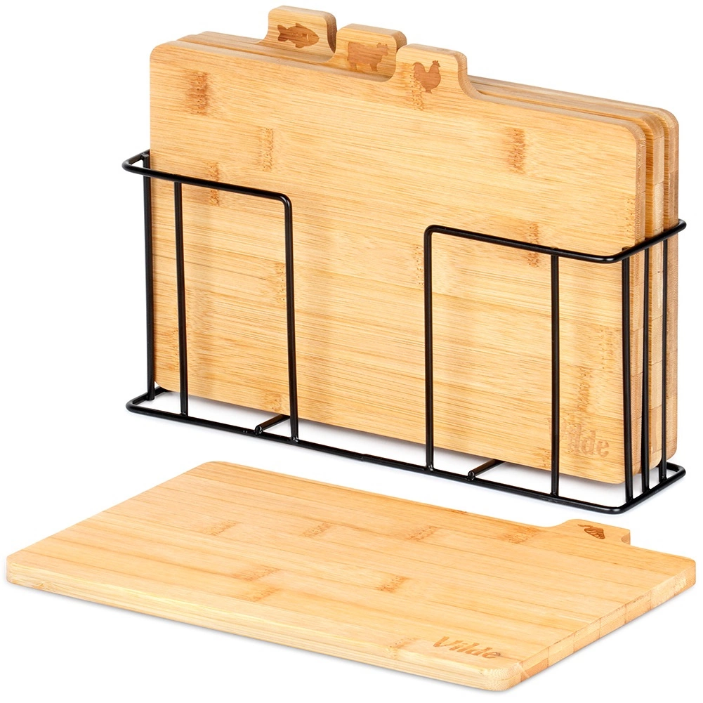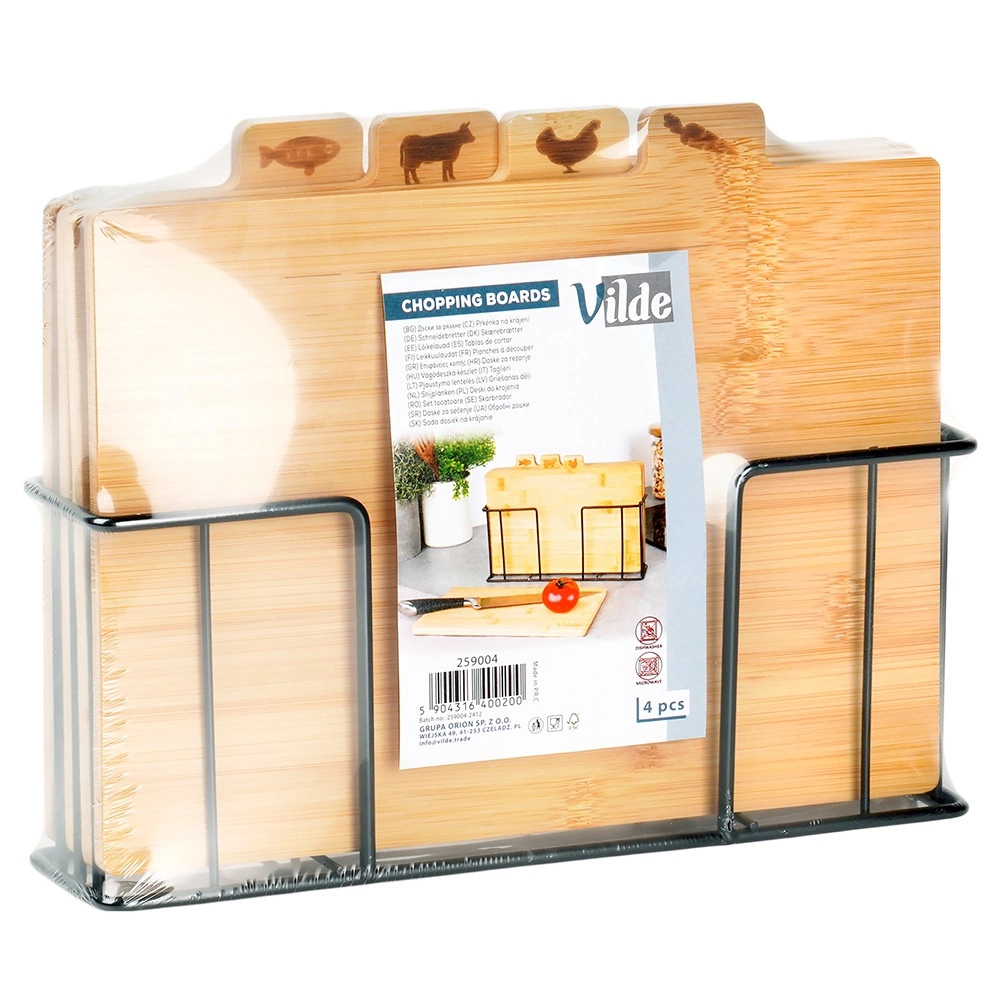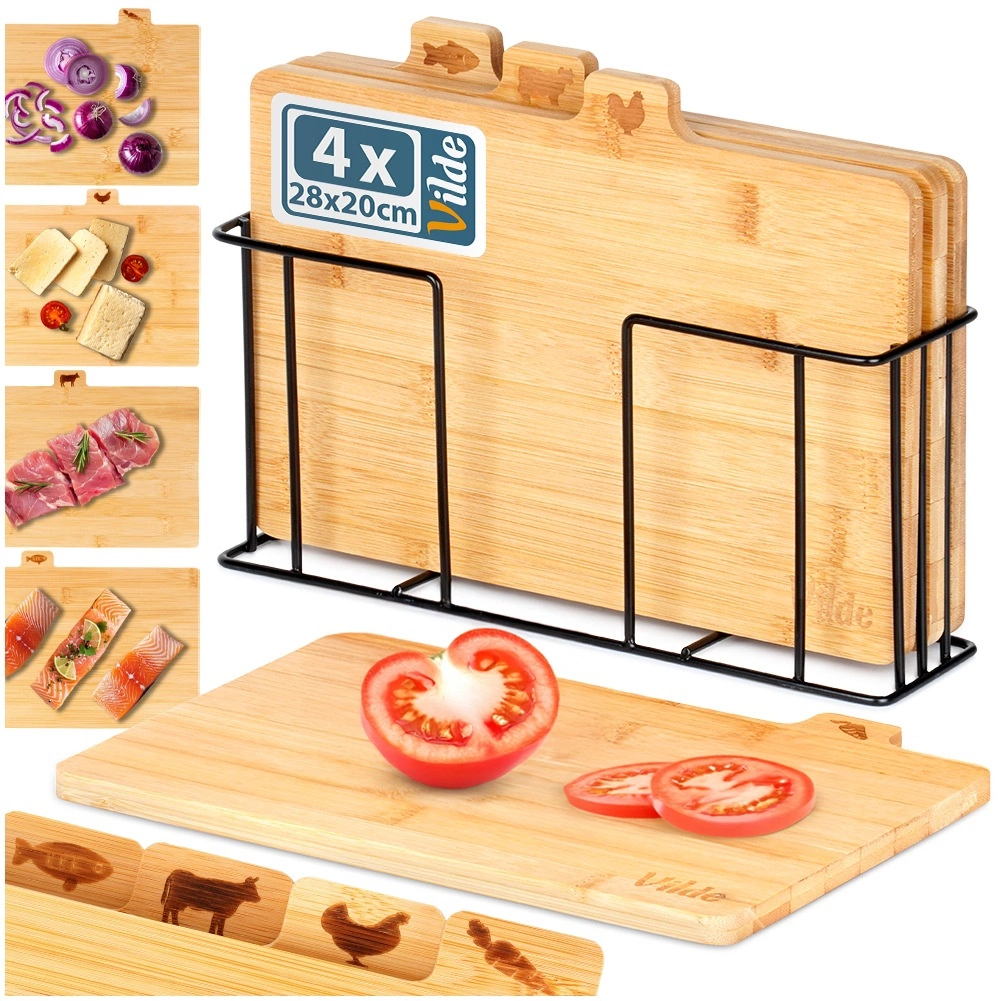 С този комплект бамбукови дъски ще поддържате кухнята в перфектен ред. Четирите отделни дъски с практични разделители и икони ясно показват предназначението им – за зеленчуци, птиче месо, червено месо и риба – като по този начин подпомагат хигиеничната подготовка на храната. Стабилната метална стойка в черен цвят гарантира, че дъските ще са винаги под ръка и подредени.