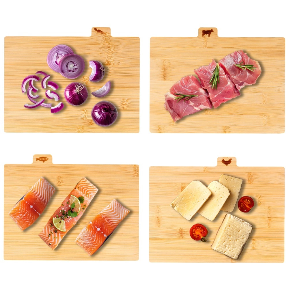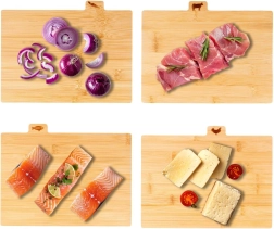 Всяка дъска има разделител с гравирана икона за конкретен вид храна – зеленчуци, птиче месо, червено месо и риба. Така лесно избягвате кръстосано замърсяване и поддържате чистота при готвене.