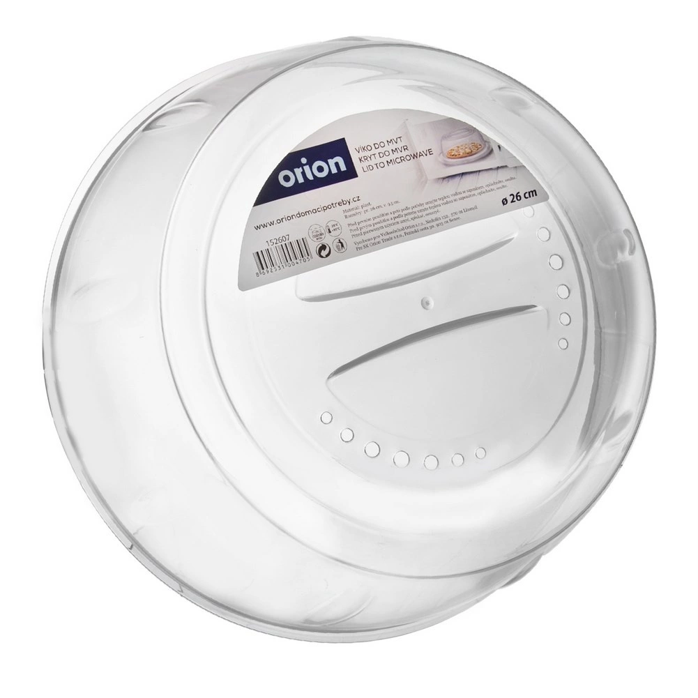Практичен прозрачен капак за микровълнова фурна с диаметър 26 cm и височина 9,5 cm надеждно предпазва от замърсяване. Благодарение на вентилационните отвори осигурява равномерно затопляне, предпазва от пръски и помага да поддържате фурната чиста. Той е издръжлив, лесен за употреба и подходящ за миене в съдомиялна машина.