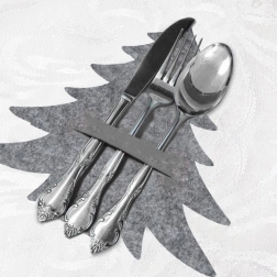 Придайте на празничната трапеза уникален чар. Елегантните сиви филцови калъфчета за прибори във формата на коледна елхичка подчертават подредбата и държат приборите заедно. Благодарение на умните прорези поставянето и изваждането на приборите е бързо и удобно, като джобът побира три големи части – лъжица, вилица и нож.