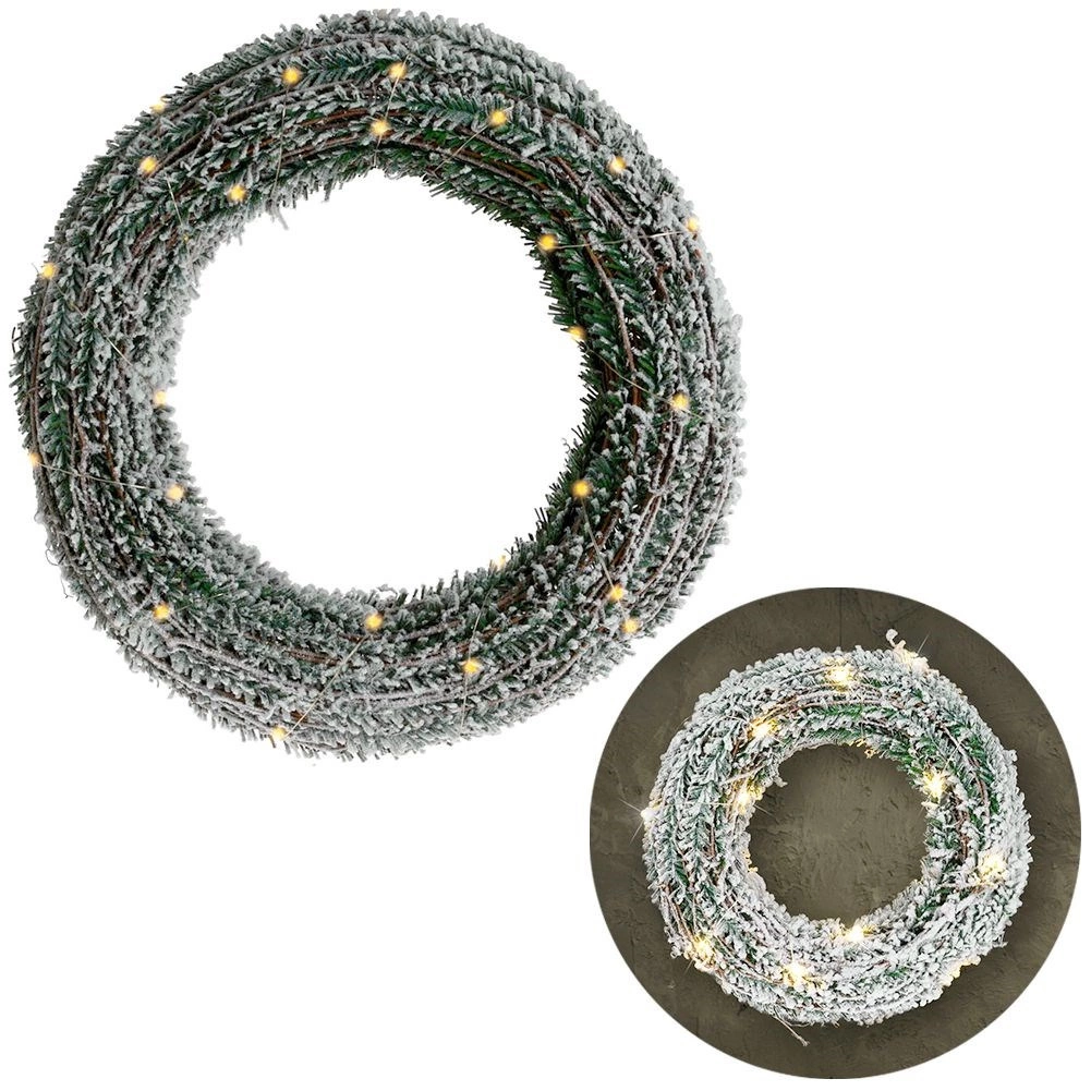 Създайте вълшебна празнична атмосфера с декоративен венец, който реалистично имитира заснежени иглички и нежно сияе благодарение на 30 топли LED. Благодарение на захранването с батерии можете да го поставите навсякъде – на врата, над камината, на прозореца или на рафт – без видими кабели и сложен монтаж.