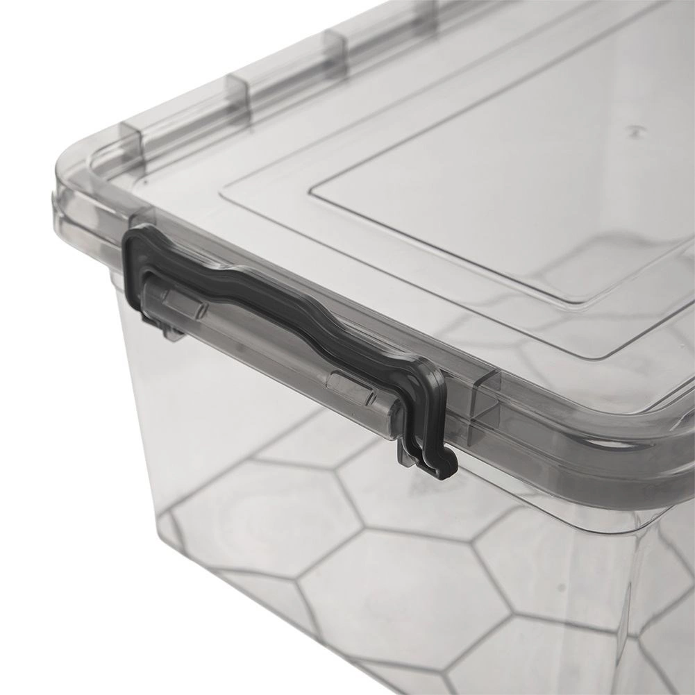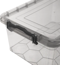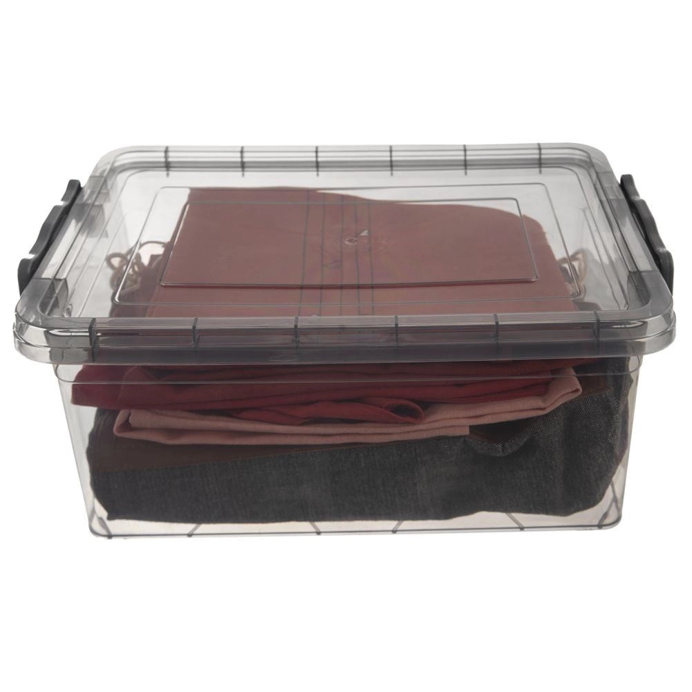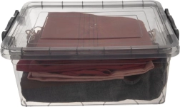 Универсална пластмасова кутия с обем 14 л и сигурен капак с клипсове е идеална за съхранение на храни, дрехи и дребни предмети. Благодарение на прозрачния тъмносив дизайн лесно виждате съдържанието без да отваряте. Материалът е без BPA, издържа на температури от -25 °C до +95 °C, подходящ е за съдомиялна, микровълнова фурна (без капака), хладилник и фризер. Затварящият се капак с два клипса предпазва съдържанието от влага и прах и позволява безопасно пренасяне.