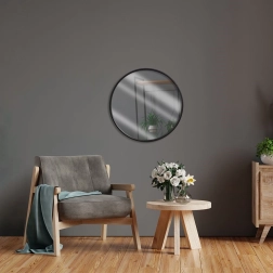 Това кръгло стеннo огледало е перфектното допълнение за хола, антрето и спалнята. Благодарение на тънкия силует в черно и дървената рамка изпъква във всеки интериор, където оптически увеличава пространството и озарява стаята. Качествената огледална повърхност осигурява кристално чист образ за ежедневна употреба.