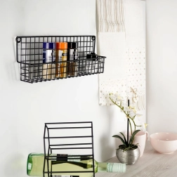 Практична висяща етажерка за подправки в елегантно черно, изработена от устойчив метал. Пести място, поддържа ред и отлично допълва модерни интериори в индустриален стил. Включен е монтажен комплект за лесна инсталация. Идеална за кухня, баня и антре. Универсално приложение, здрава метална конструкция, стил LOFT.