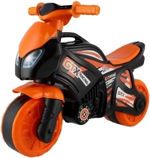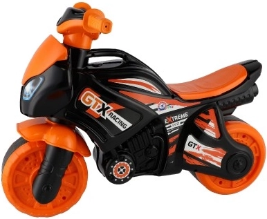 Детското колело за балансиране тип мотор със спортен дизайн ще зарадва всички малки любители на високата скорост. Благодарение на издръжливата пластмасова конструкция е идеално за забавна и безопасна игра. Дизайнът е предимно оранжево-черен с лога GTX Racing, които придават усещане за истински състезателен мотор.