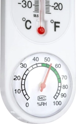 Практичен аналогов термометър с хигрометър за измерване на температура и влажност у дома и навън. Предлага широк диапазон на измерване, четлива двойна скала (°C/°F) и лесно окачване благодарение на отвора в горната част. Здравата пластмасова изработка в бял цвят отлично пасва на балкон, тераса и в интериора.
