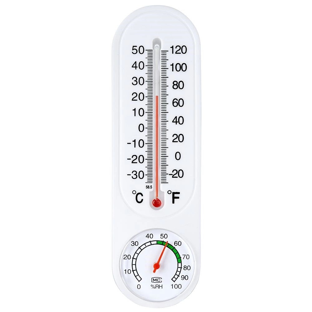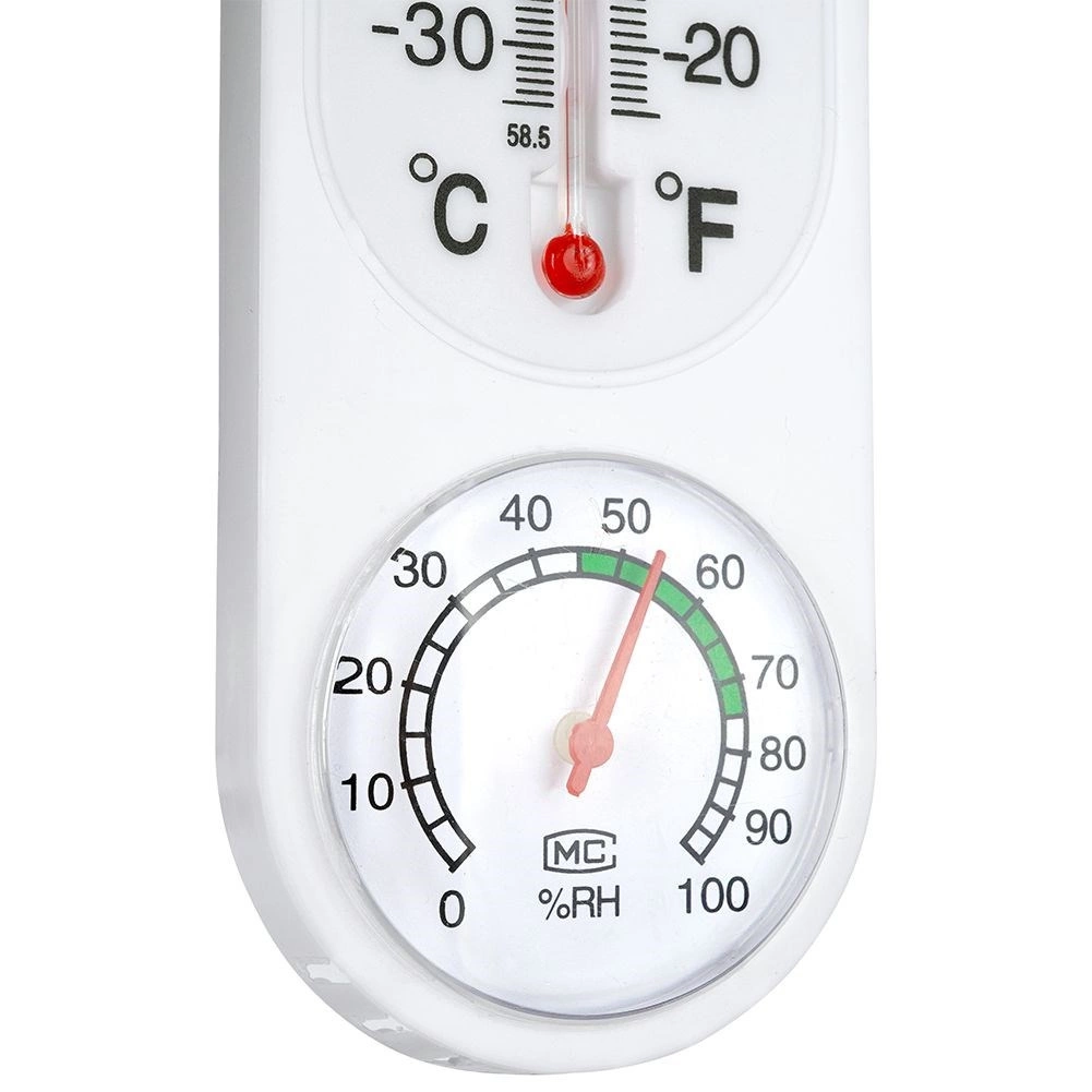 Този комбиниран термометър и хигрометър ви позволява да следите околна температура и относителна влажност в реално време. Вертикалната течна колона показва температура в °C и °F, докато долният кръгъл циферблат показва влажност в диапазон 0–100% RH с комфортна зона за бърза ориентация.