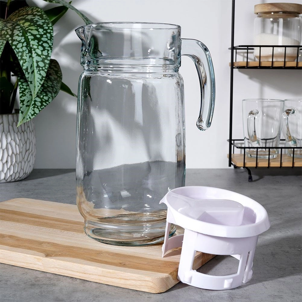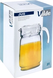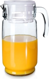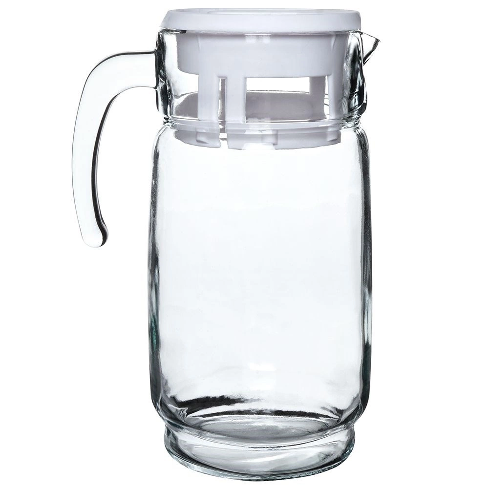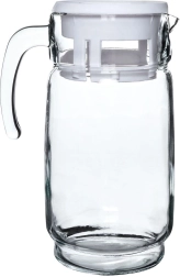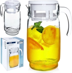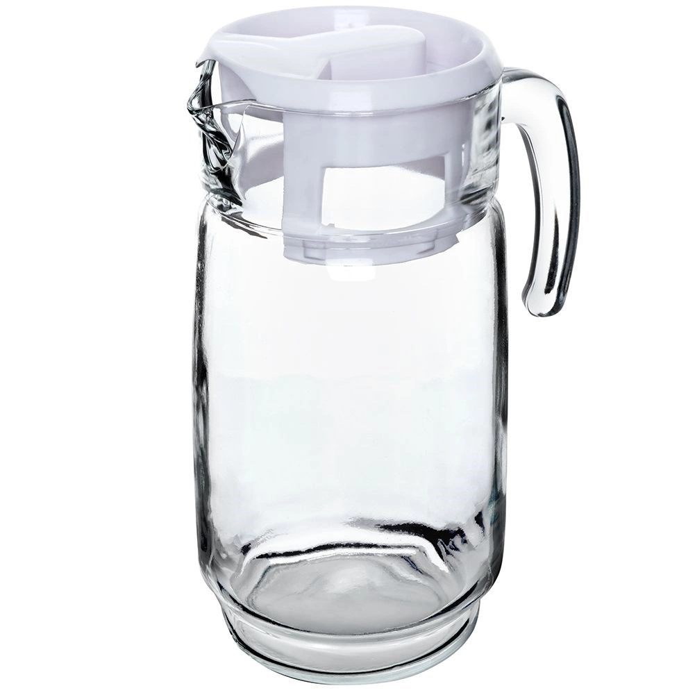 Елегантна стъклена кана с бял капак и вместимост до 2 литра, идеална за вода, сокове, лимонади и студени чайове. Благодарение на здравата дръжка и оформения чучур напитките се наливат удобно и без капки. Практичният капак предпазва съдържанието от замърсявания и насекоми, а прозрачното стъкло придава декоративен вид на вашата маса.