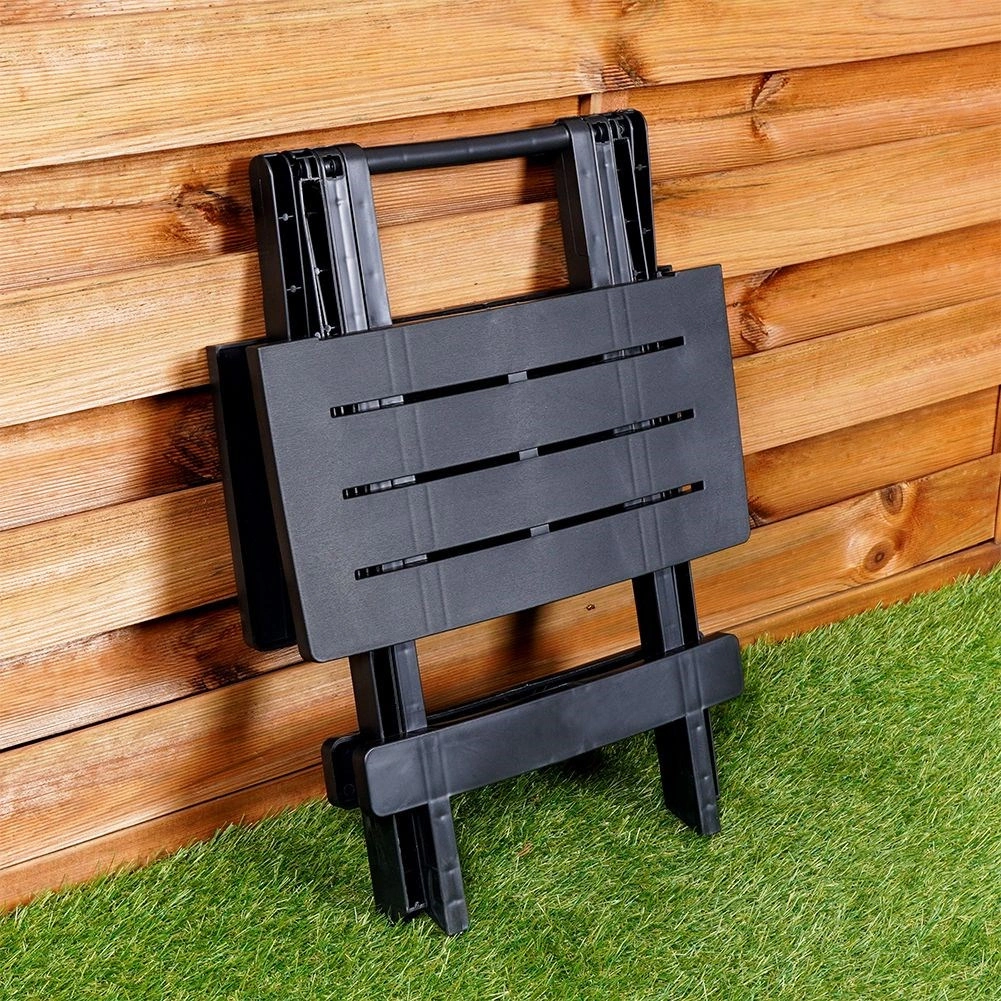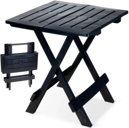 Компактна сгъваема градинска масичка в елегантен черен цвят, идеална за градината, балкона и къмпинг. Предлага размери на плота 44 × 44 см, височина 50 см и товароносимост до 12 кг. Тя е лека, устойчива на атмосферни влияния и водоустойчива. Благодарение на бързото сгъване и практичната дръжка се пренася лесно и заема минимално място.
