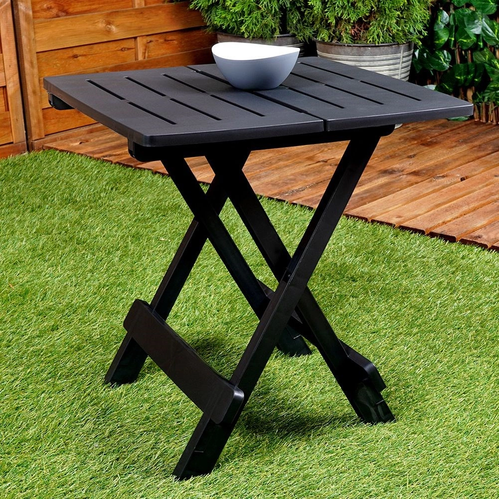 Търсите практична и универсална масичка за външна употреба? Тази сгъваема градинска масичка в черен цвят е чудесен избор за градина, балкон, тераса и пътуване. Стабилната конструкция с четири крака осигурява надеждна употреба – както при сервиране, поставяне на напитки, така и като поставка за цветя и декорации.