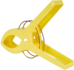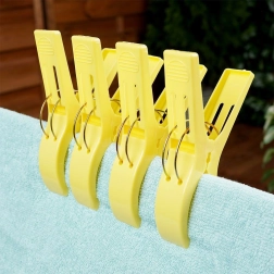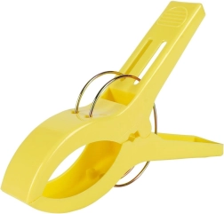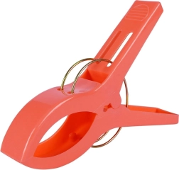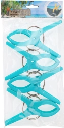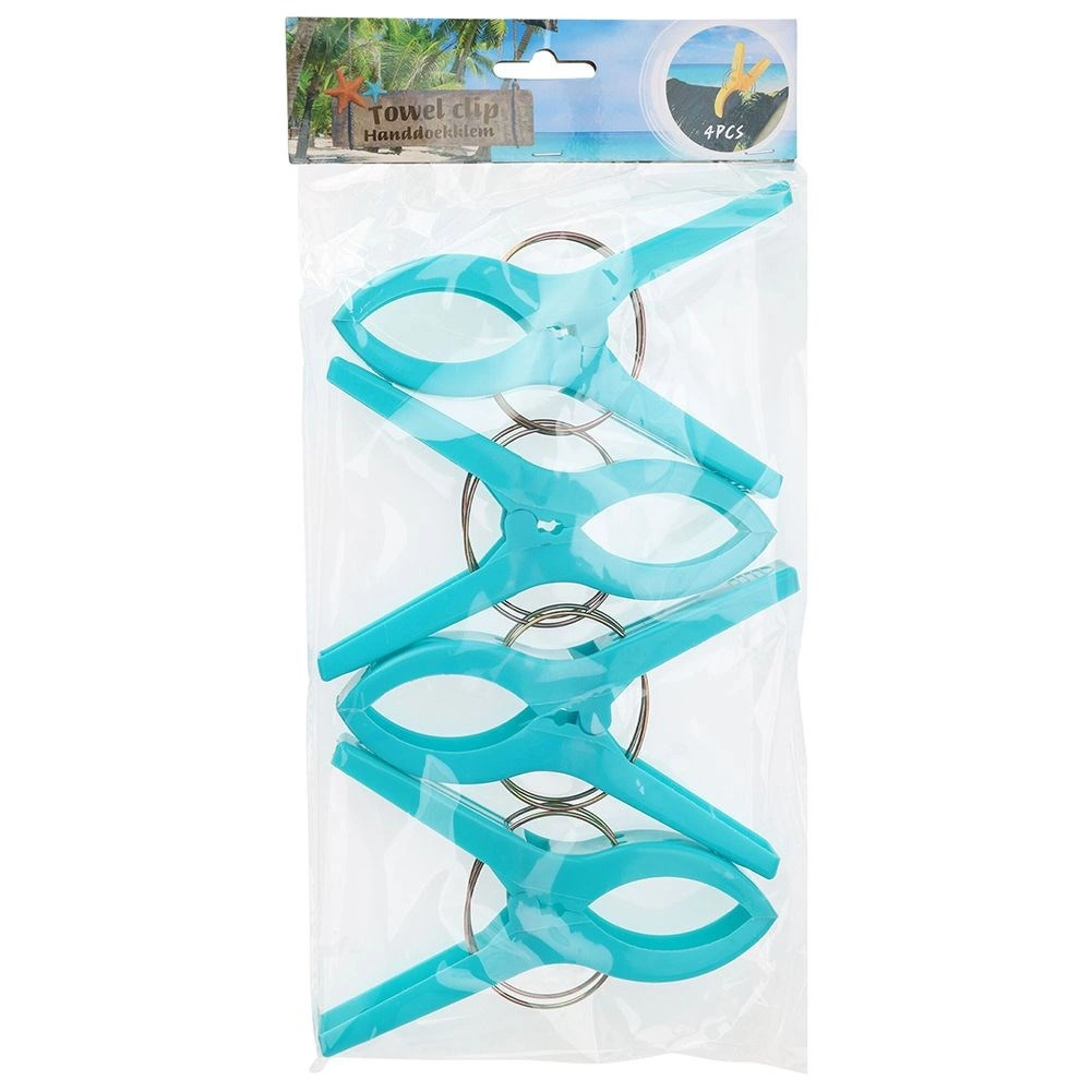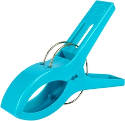 Практичен комплект от четири щипки за плажна кърпа или одеяло гарантира, че вятърът вече няма да ги отвее. Всяка щипка с форма на щипка за пране е с размери 15 × 10 cm, изработена е от качествена пластмаса и се доставя в различни цветове (изпращаме на случаен принцип). За бързо закрепване на кърпата към шезлонг или плажен стол щипките са изключително функционални, издръжливи и универсални – идеални за плаж, къмпинг и палатка.
