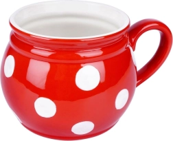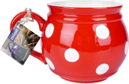 Стилна керамична чаша с обем 950 мл в червен цвят с бели точки, идеална за ежедневна употреба. Благодарение на удобната дръжка и формата „beczułka“ се държи отлично и е подходяща за чай, кафе, какао, билкови напитки и греяно вино. Изработена от висококачествена керамика, издръжлива, лесна за почистване и безопасна за контакт с храни.