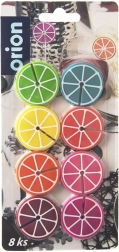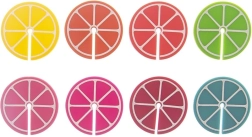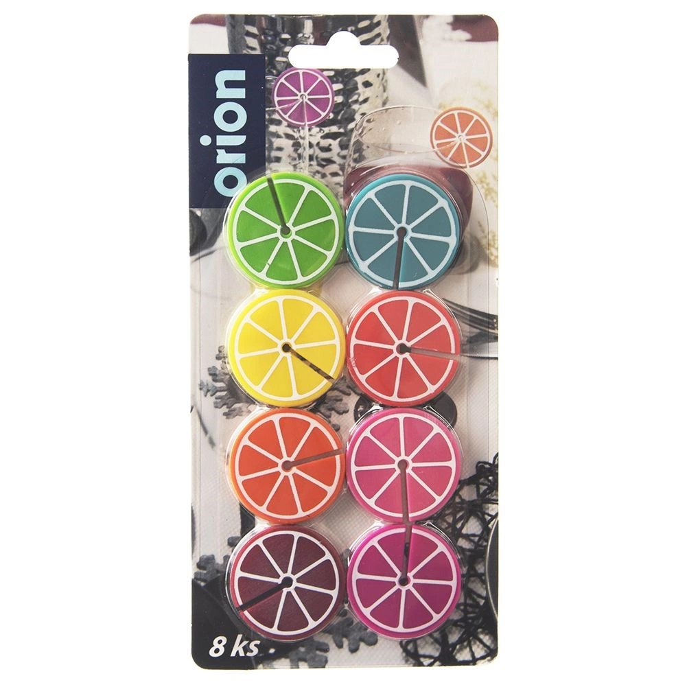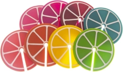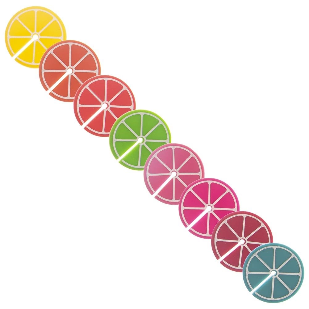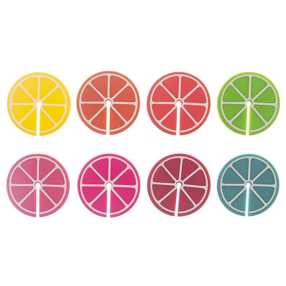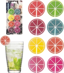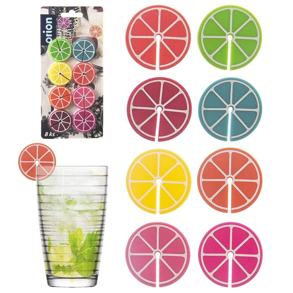 Практичен комплект от 8 цветни маркера за чаши и чашки във формата на цитрусови резени с диаметър 3,7 см. Благодарение на различните цветове всеки гост лесно разпознава своята напитка. Изработени от силикон, подходящи за многократна употреба, идеални за празненства и семейни събирания.