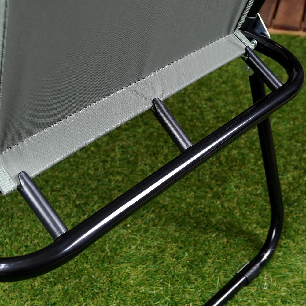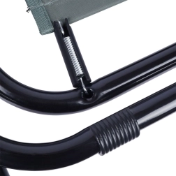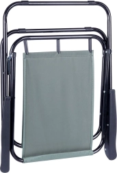 Столът е изработен от висококачествени материали: издръжлива полиестерна материя в сив цвят, устойчива на всекидневна употреба, черна метална рамка, която осигурява стабилност и дълъг живот, и пластмасови подлакътници за по-голям комфорт при седене. Конструкцията позволява бързо сгъване и разгъване за секунди.