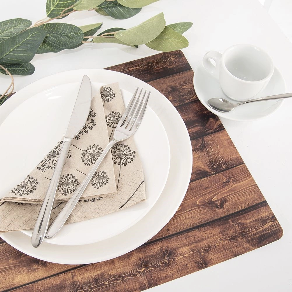 Подложката за маса с реалистичен дървесен декор е практично и декоративно допълнение към кухнята или трапезарията. Благодарение на размерите 43 × 30 см приляга идеално под чинията, защитава плота на масата от петна и надрасквания и едновременно подчертава вашия сервиз.
