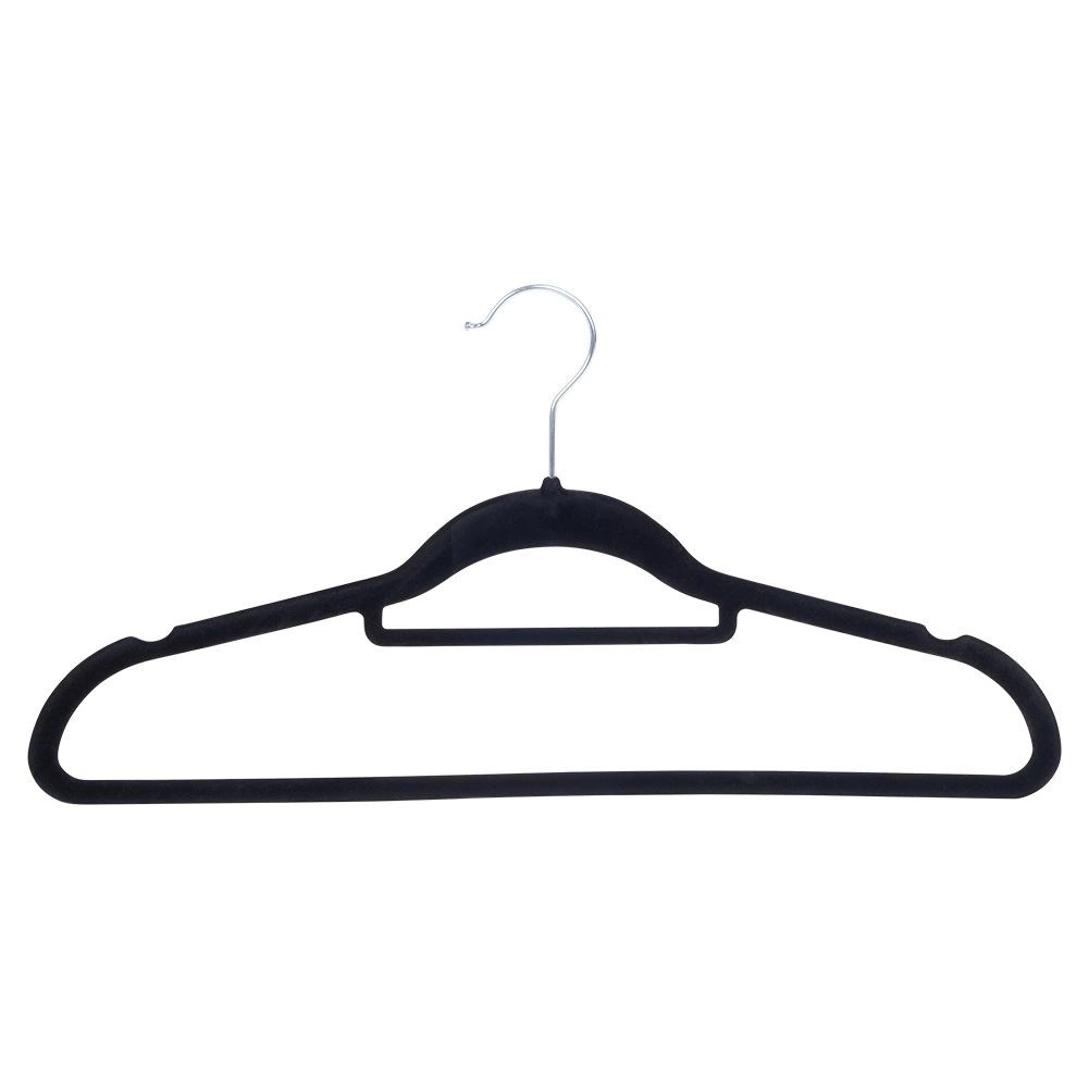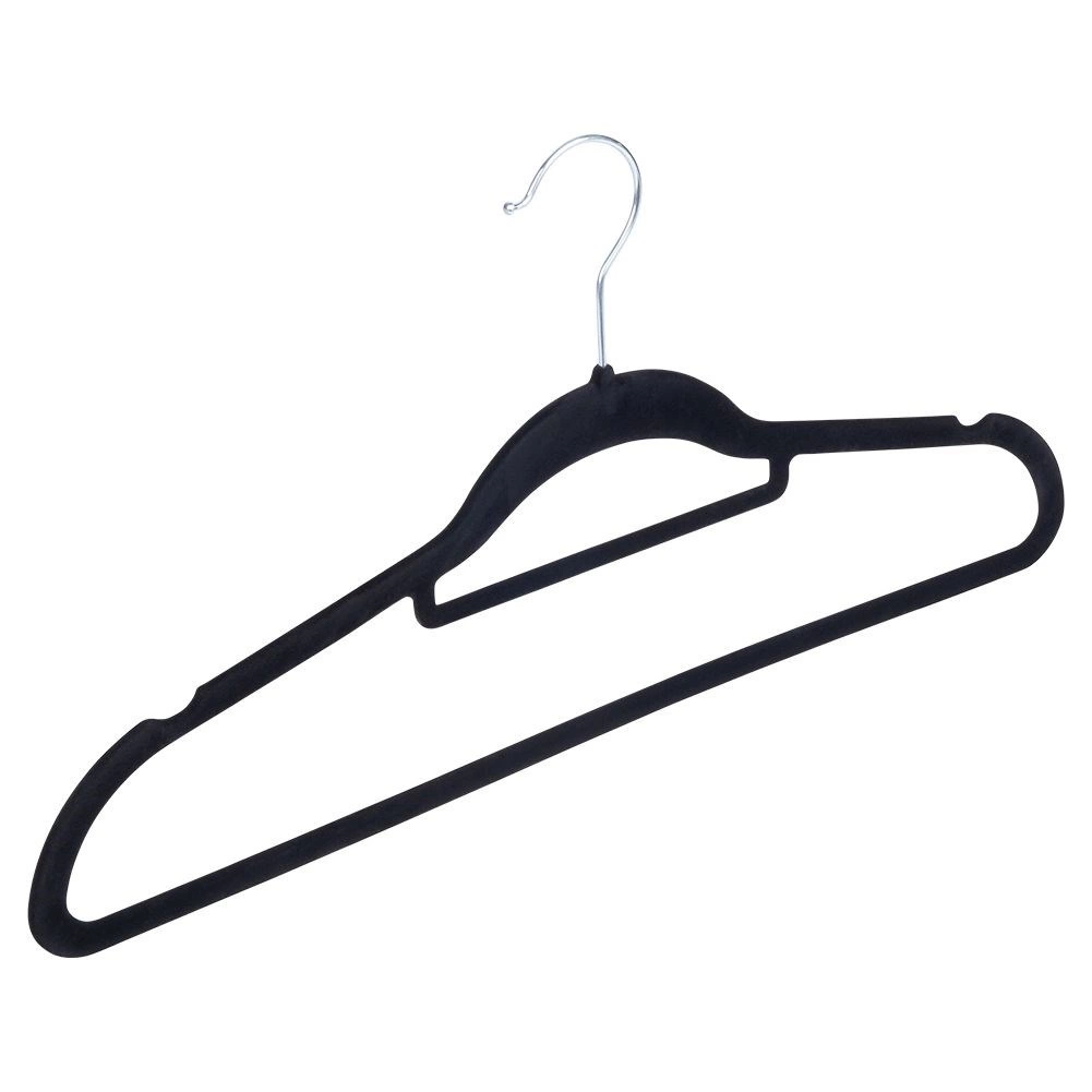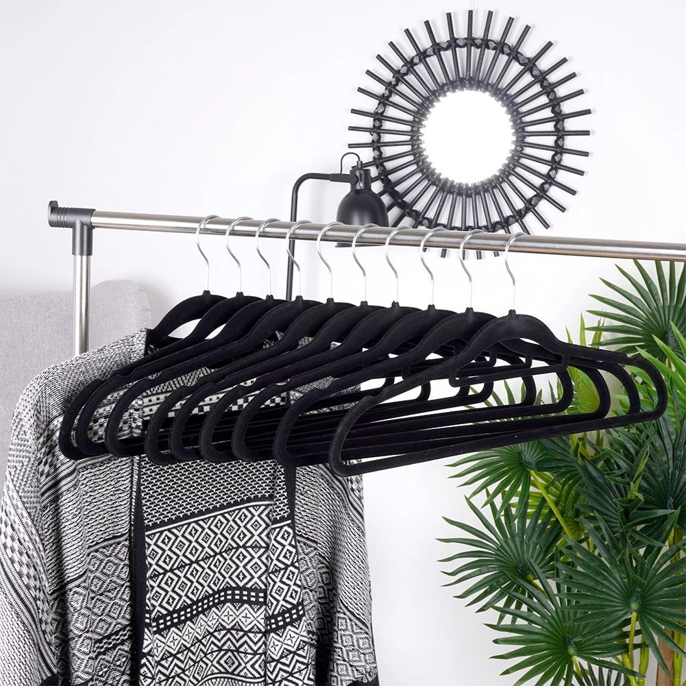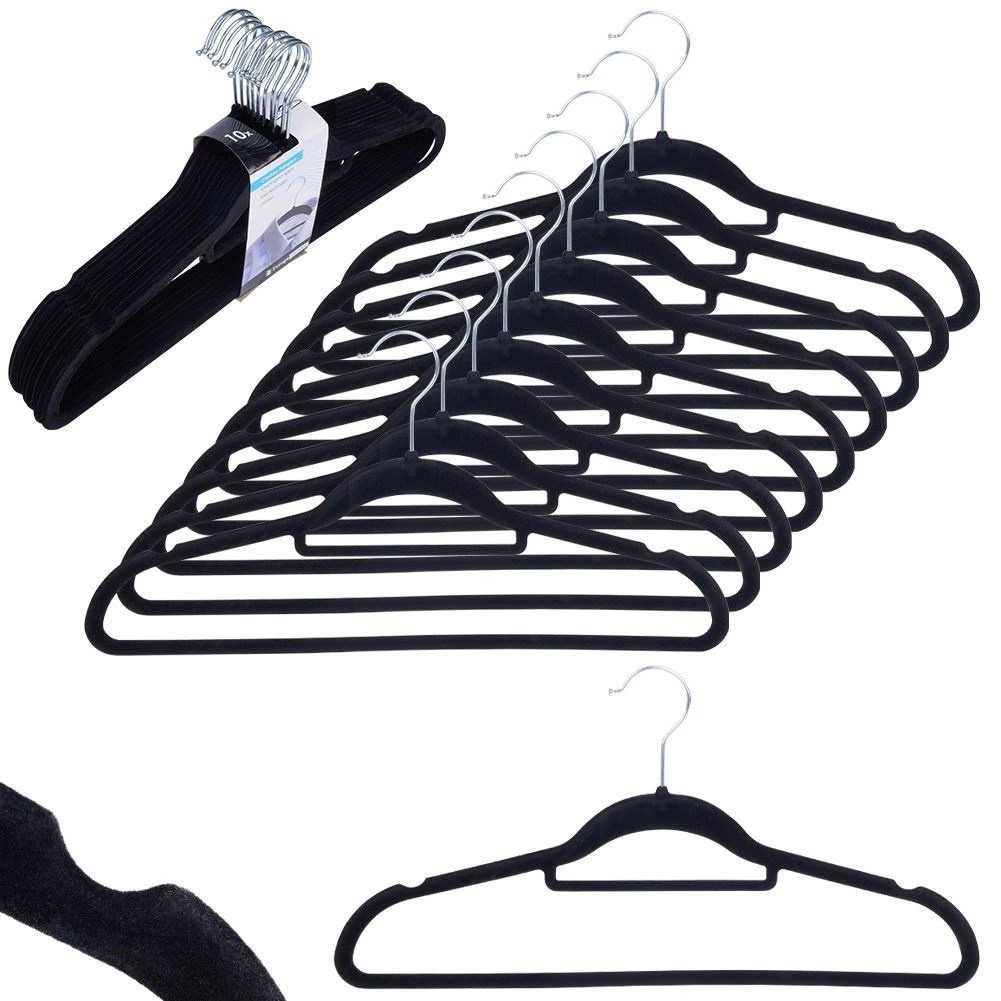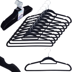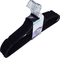 Практичен комплект от 10 тънки закачалки с фин кадифен финиш помага да поддържате гардероба подреден и пести място. Противохлъзгащото покритие държи дрехите сигурно на място, а въртящият се метален кукич улеснява окачването във всяка посока.