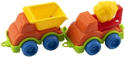 Самосвал, бетоновоз и други машини приканват към творческа игра. Децата могат да превозват, товарят и „строят“ според своето въображение.