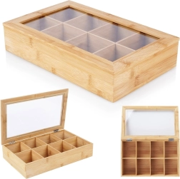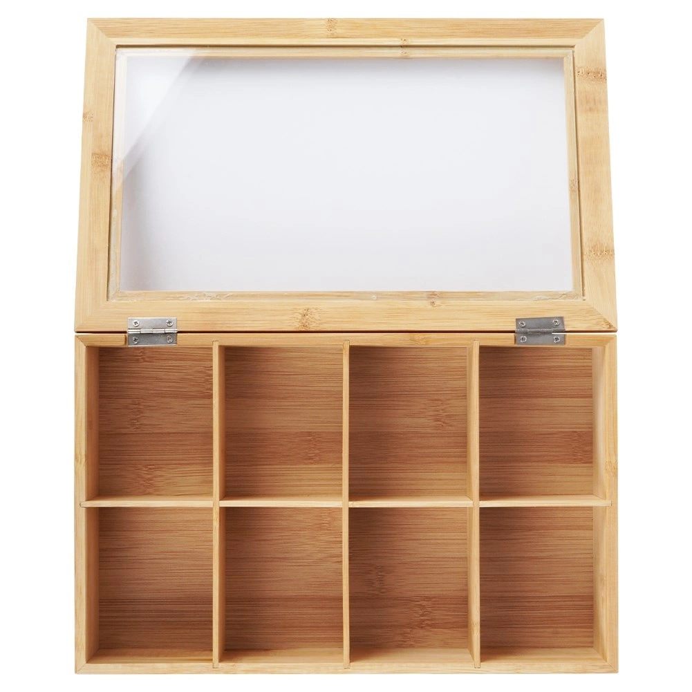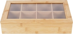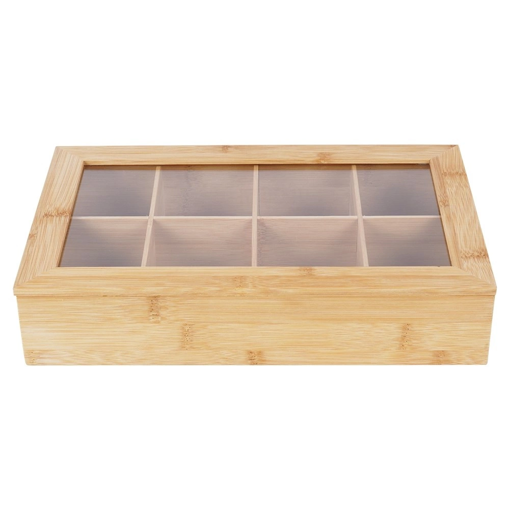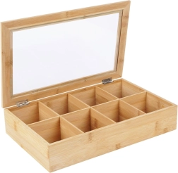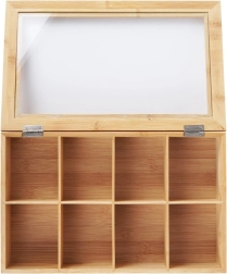 Тази стилна бамбукова кутия за чай предлага умно и естетично решение за съхранение на пакетчета чай. Благодарение на осемте отделни отделения лесно сортирате различни видове и вкусове чай. Прозрачният капак позволява бърз преглед на съдържанието без да отваряте кутията.