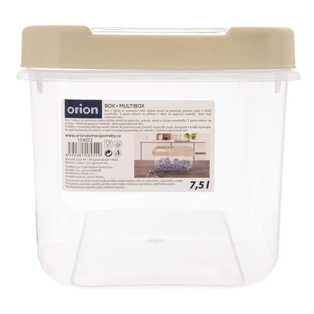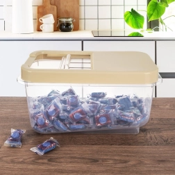 Този универсален контейнер с обем 7,5 л помага да поддържате ред в кухнята, килера и банята. Прозрачното тяло позволява незабавна проверка на наличностите без отваряне, а бежовият капак с плъзгащ се отвор/затваряне осигурява удобно дозиране и бърз достъп.