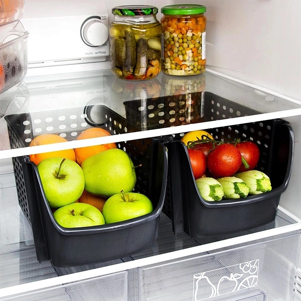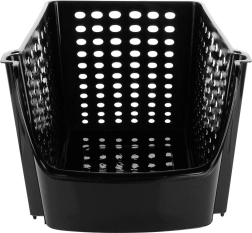 Универсалната кошница от здрава пластмаса без BPA е идеална за ежедневна организация в кухнята. Перфорираните стени подпомагат циркулацията на въздуха, което помага плодовете и зеленчуците да останат по-дълго свежи. Отвореният преден изрез позволява бързо поставяне и изваждане на съдържанието, независимо дали кошницата стои на плота или е поставена на рафт.