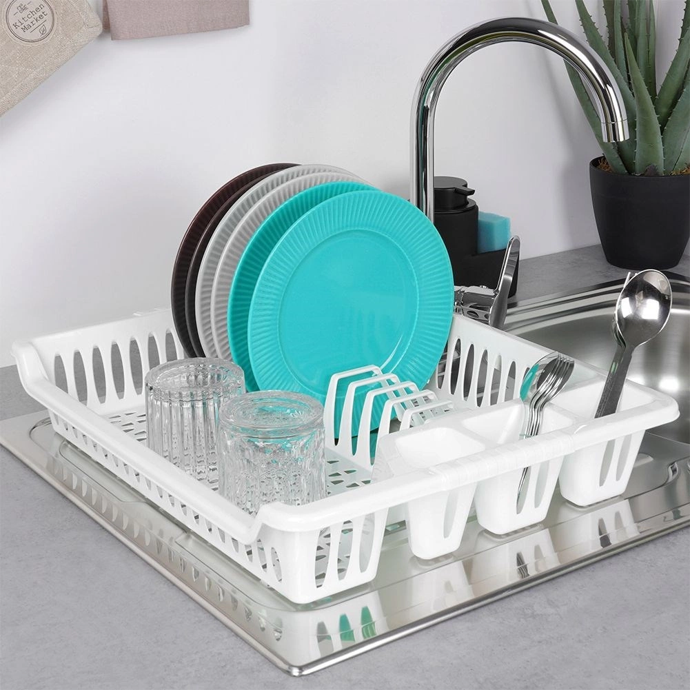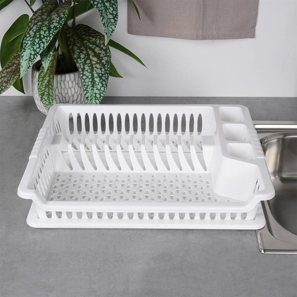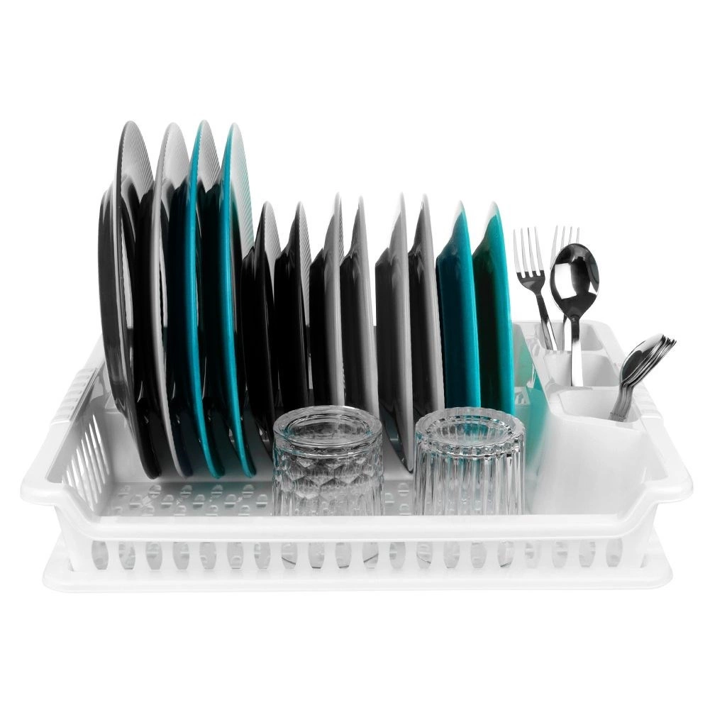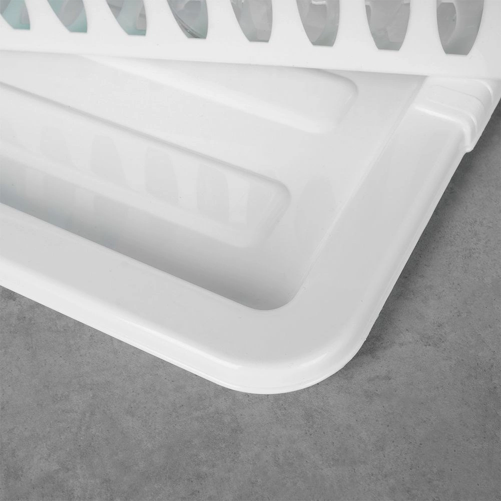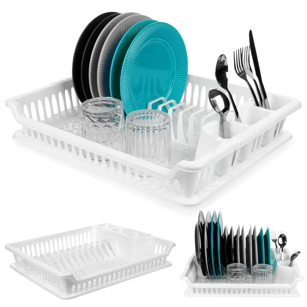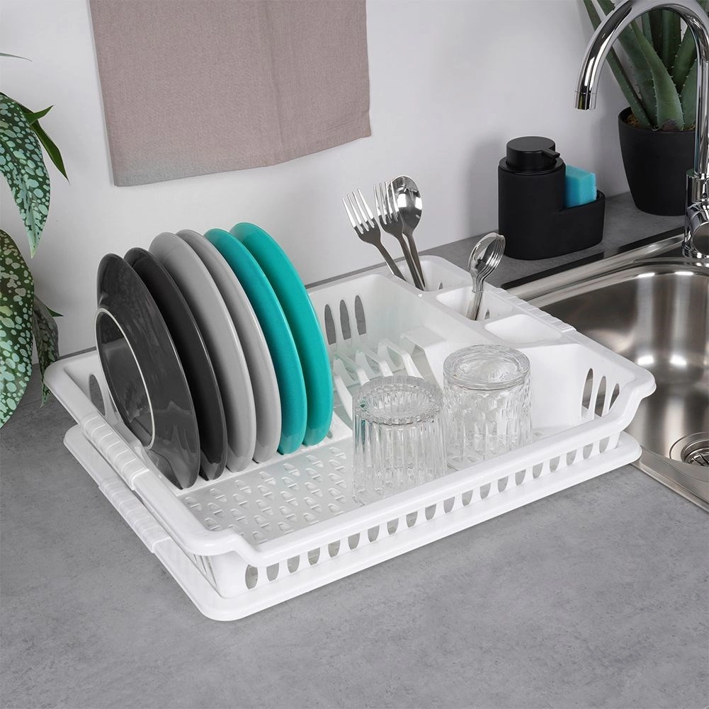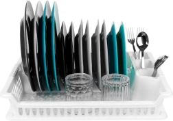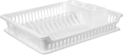 Практичен бял сушилник за съдове с размери 46 × 37 × 8,5 см с подвижна отцедна табла. Благодарение на обмислените отделения за чинии, чаши и прибори ще поддържате кухнята си организирана и със сух плот. Той е лек и издръжлив, изработен от висококачествен пластмасов материал без BPA, лесен за почистване и идеален за ежедневно сушене на съдове.