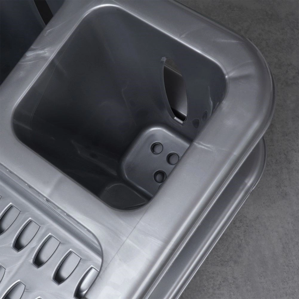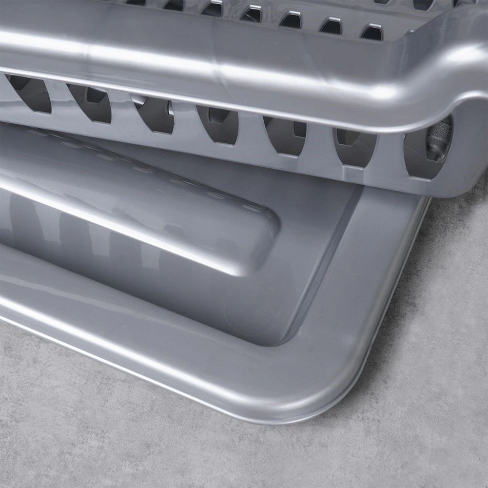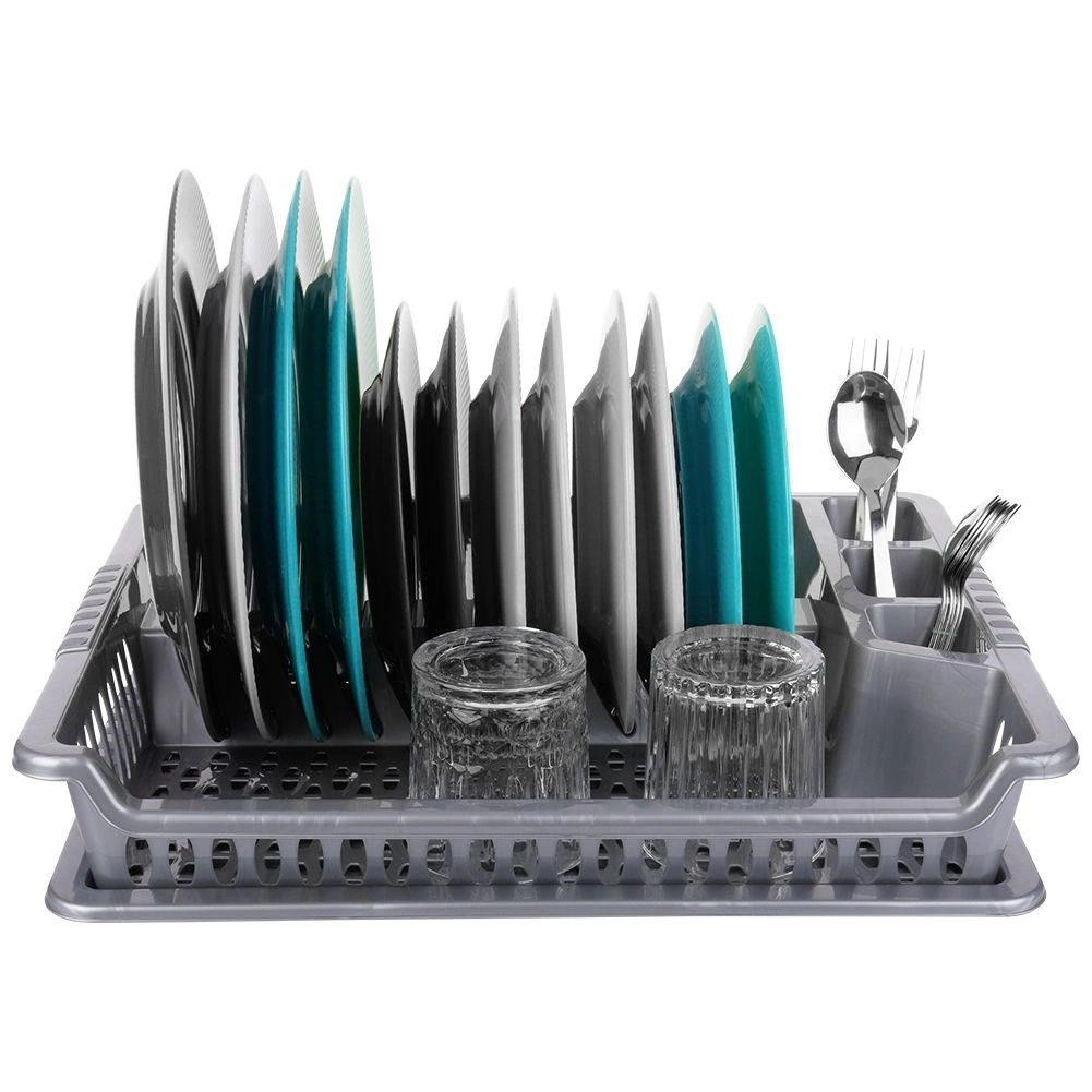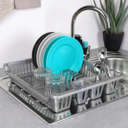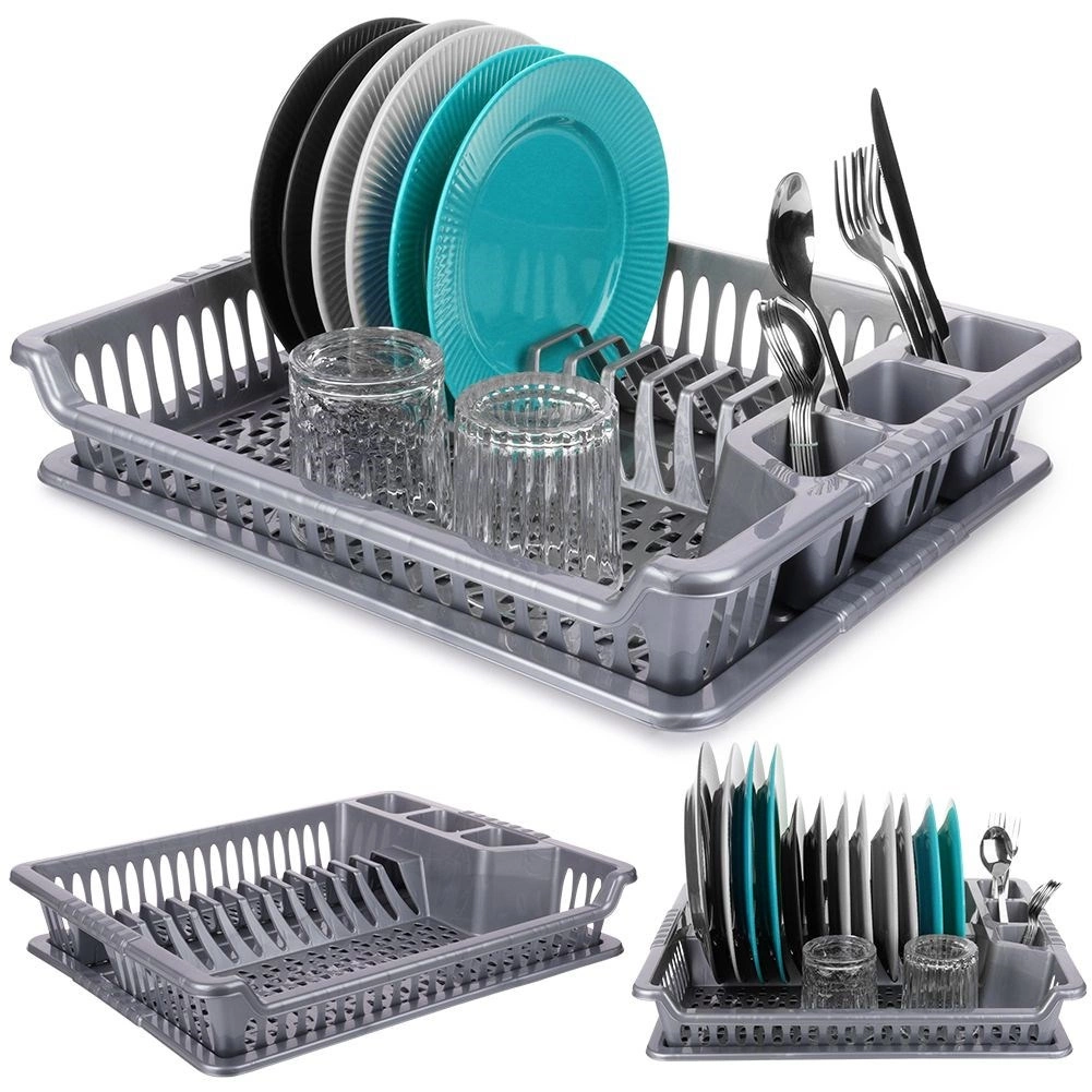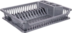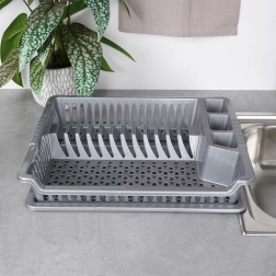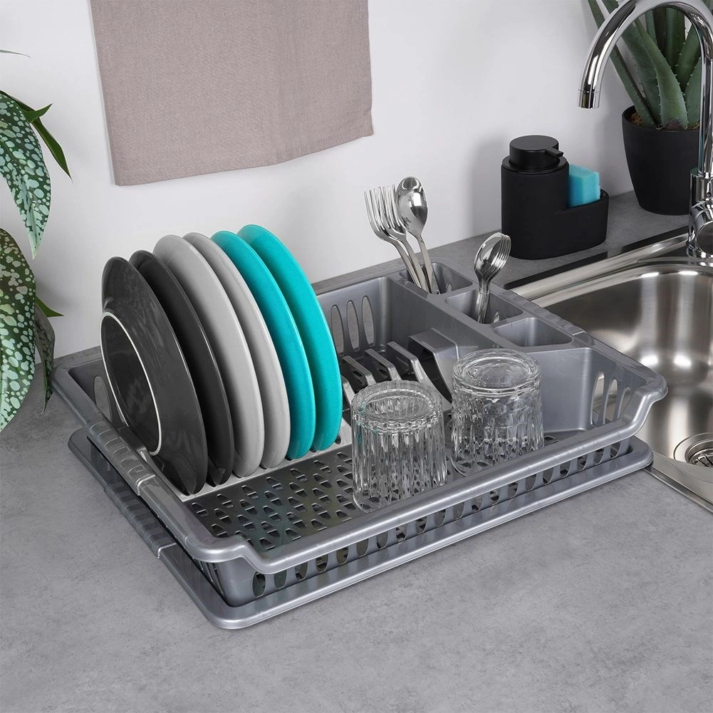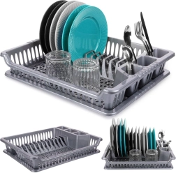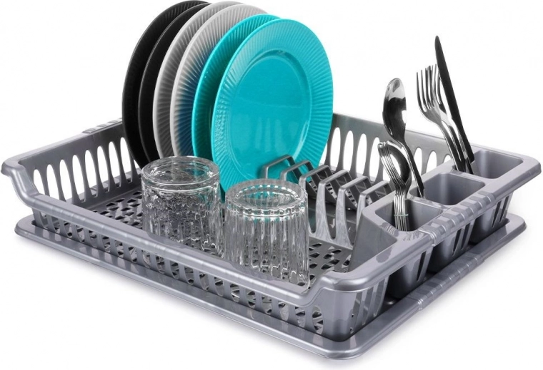 Практичен сив сушилник за съдове с размери 46 × 37 × 8,5 cm улеснява ежедневното миене. Има отделни слотове за чинии, място за чаши и три отделения за прибори. Благодарение на подвижната отцеждаща тава плотът остава сух, а поддръжката е лесна. Изработен от издръжлива пластмаса без BPA, леко и стабилно решение за модерни и класически кухни.