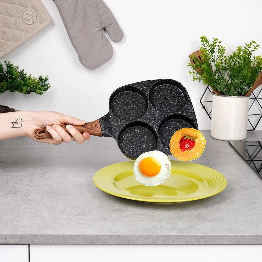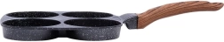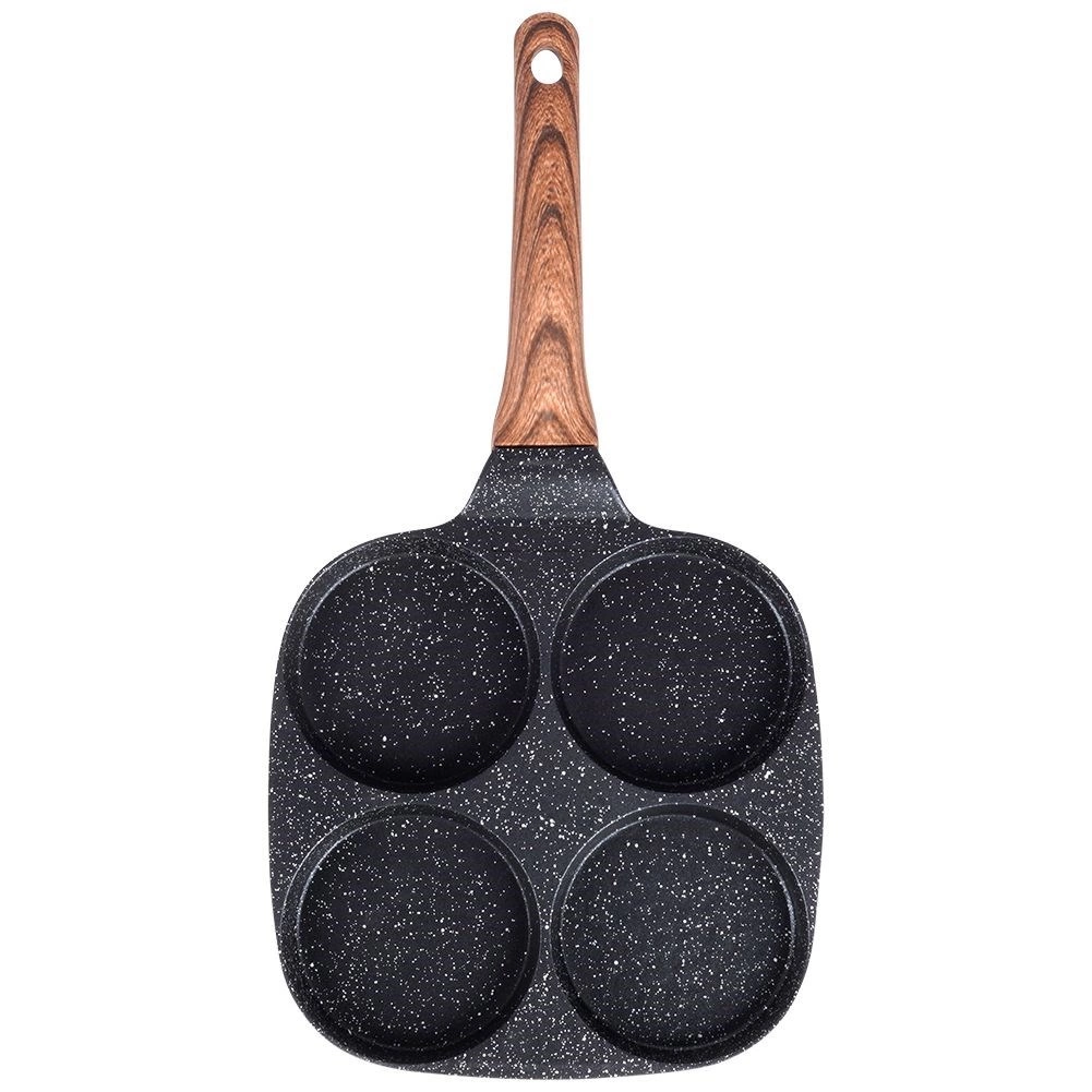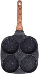 Практичен тиган с четири кръгли форми с диаметър 8,5 см за перфектно оформени яйца, мекици/палачинки и мини палачинки. Устойчиво алуминиево тяло с нелепнещо гранитно покритие в черен цвят позволява готвене с минимум мазнина, равномерно разпределя топлината и пести време и енергия. Ергономична дръжка с дървесен декор е удобна, нехлъзгаща се и има отвор за окачване. Тиганът е подходящ за газ, електричество, стъклокерамика, халоген и индукция и е лесен за почистване, включително в съдомиялна.