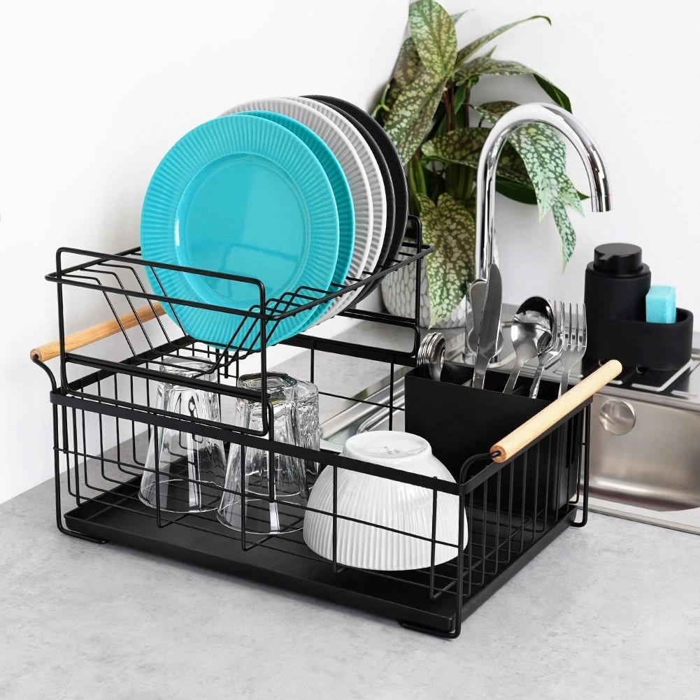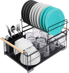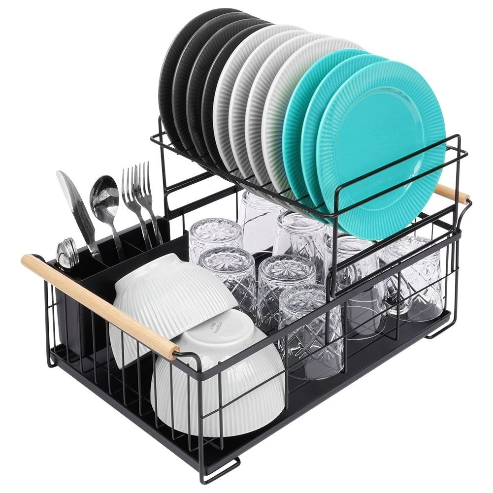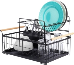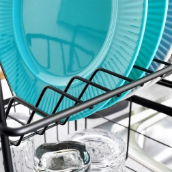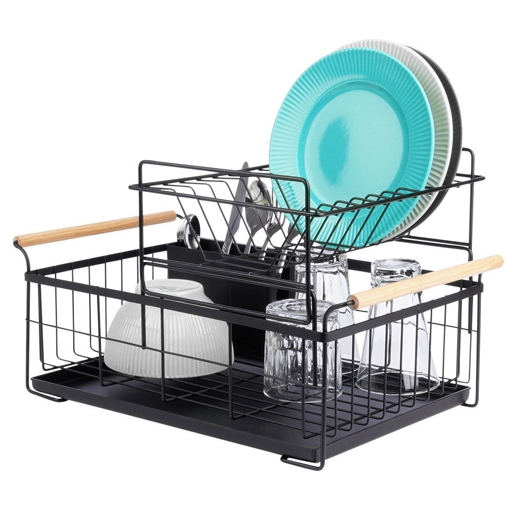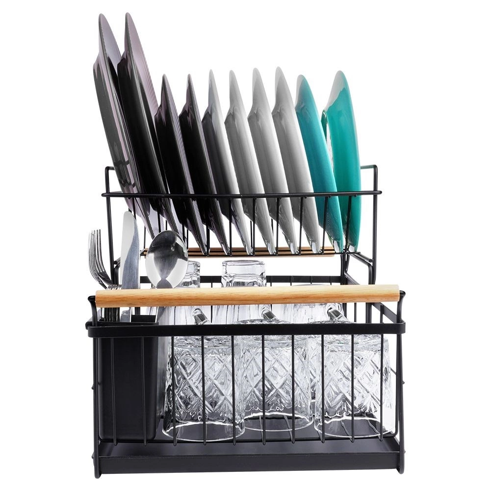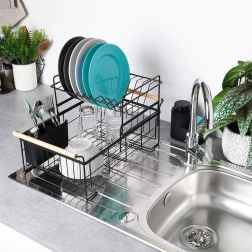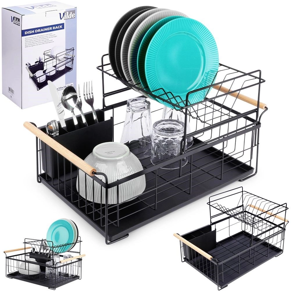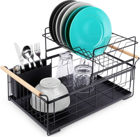 Елегантният двуетажен сушилник за съдове в черен цвят пести място и поддържа кухненския плот сух и подреден. Предлага подвижна тавичка за отцеждане, двукамерна кошничка за прибори и практични бамбукови дръжки за лесно пренасяне. Изработен е от издръжлив метал, има място за чинии, купи, чаши и прибори и отлично се вписва в интериор в индустриален стил. Двуетажната конструкция увеличава капацитета и ускорява сушенето на съдовете.