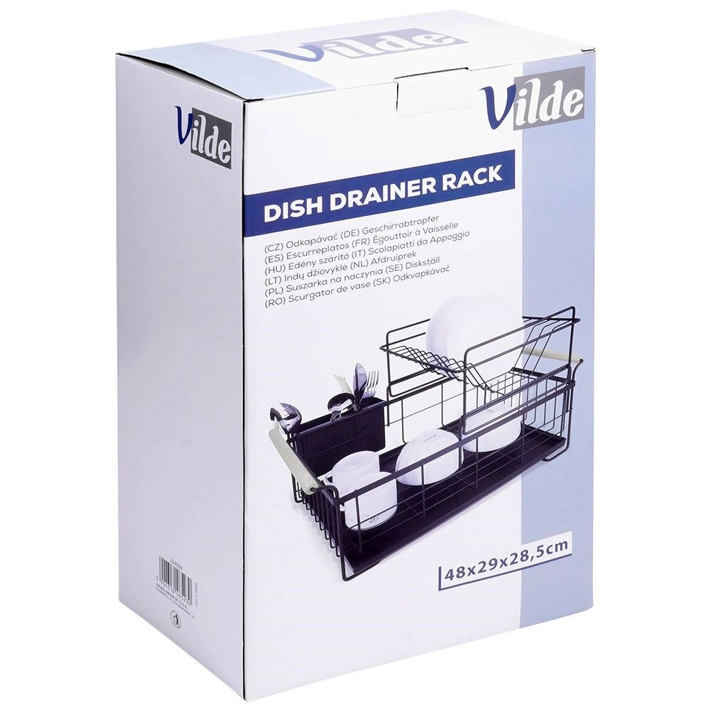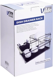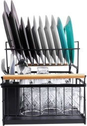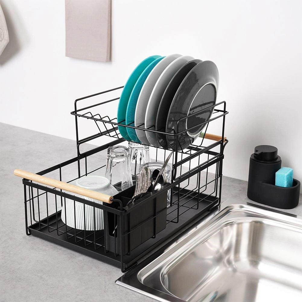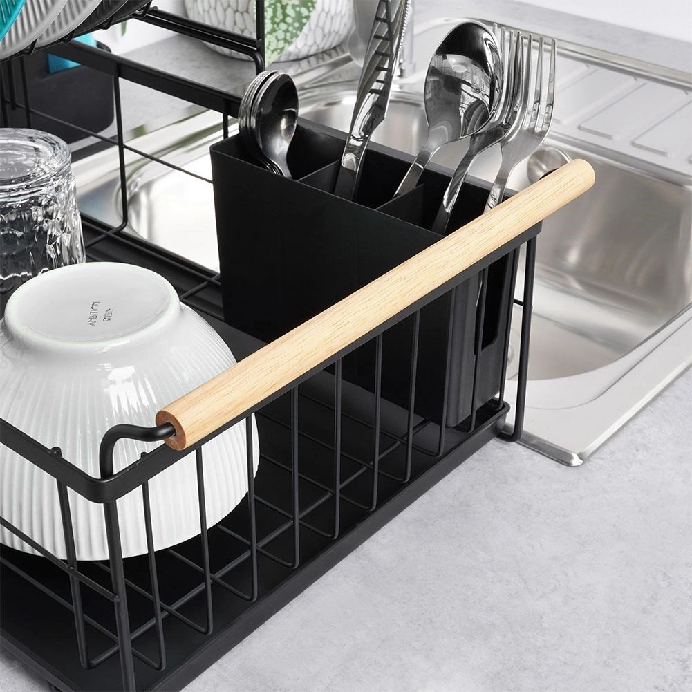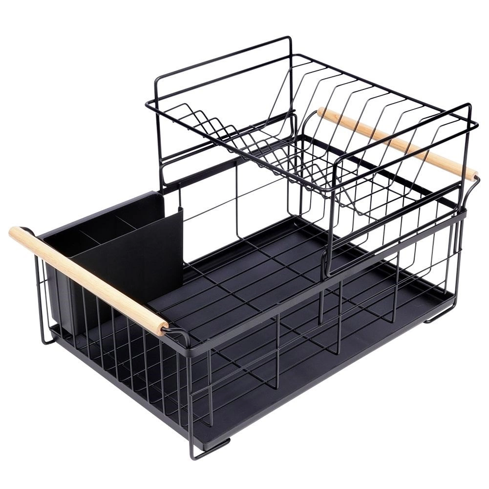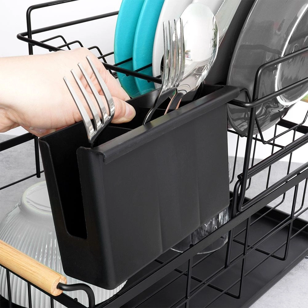 Елегантният двуетажен сушилник за съдове в черен цвят пести място и поддържа кухненския плот сух и подреден. Предлага подвижна тавичка за отцеждане, двукамерна кошничка за прибори и практични бамбукови дръжки за лесно пренасяне. Изработен е от издръжлив метал, има място за чинии, купи, чаши и прибори и отлично се вписва в интериор в индустриален стил. Двуетажната конструкция увеличава капацитета и ускорява сушенето на съдовете.
