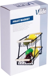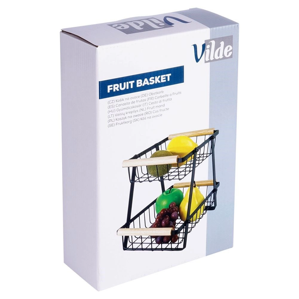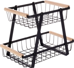 Кошницата е отлична не само за храни, но и като универсален органайзер за печива, кутии, подправки или офис консумативи. Двуетажното решение пести място на плота и поддържа вещите прегледно подредени. Вечната комбинация от матово черно и дърво пасва както на модерни, така и на класически интериори.