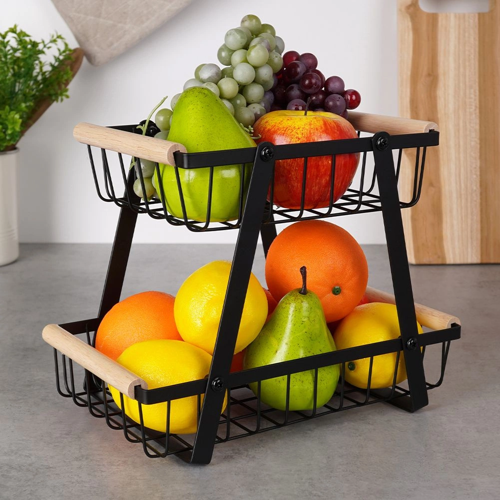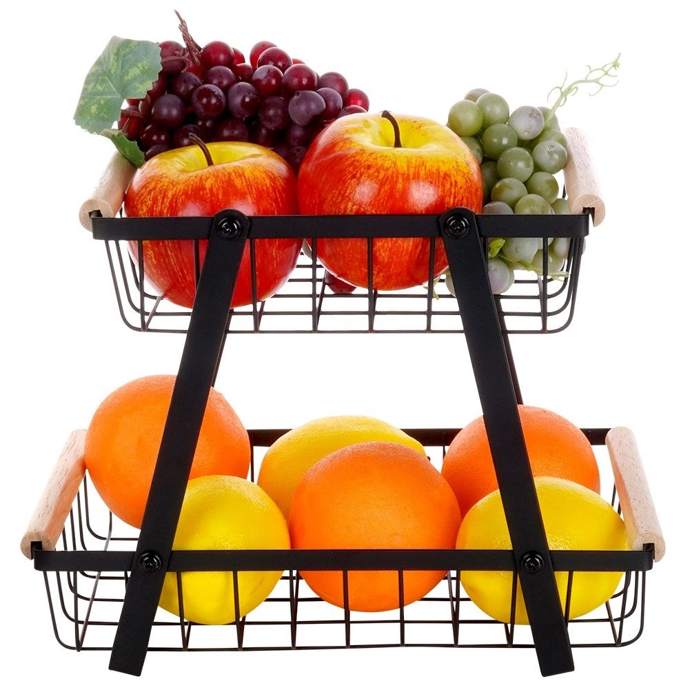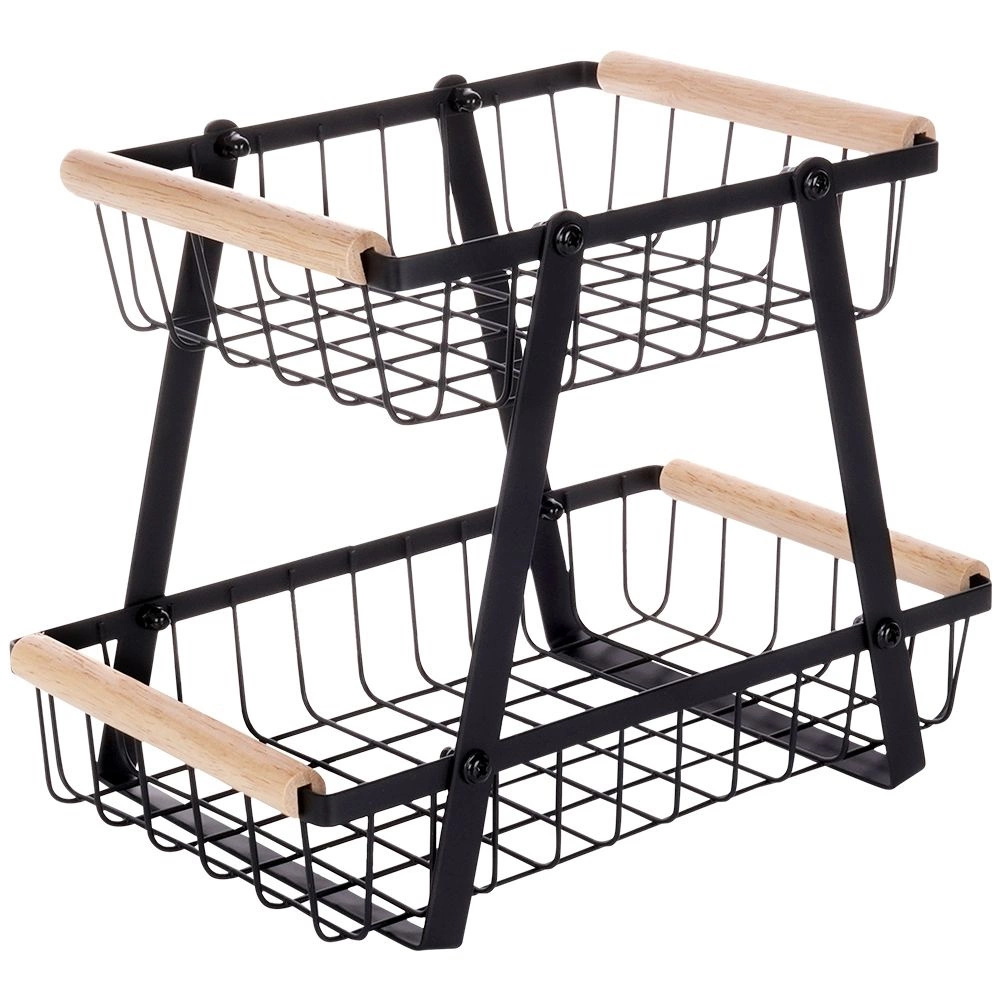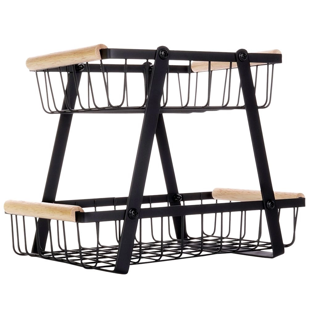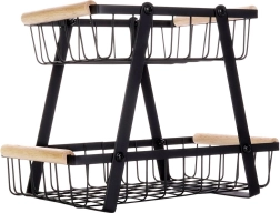 Този двуетажен метален органайзер съчетава модерен индустриален вид с висока функционалност. Отворените телени стени осигуряват оптимално движение на въздуха, благодарение на което плодовете и зеленчуците запазват свежестта си по-дълго. Дървените дръжки гарантират удобно пренасяне, а целият стойка е издръжлива и стабилна благодарение на здравата конструкция.