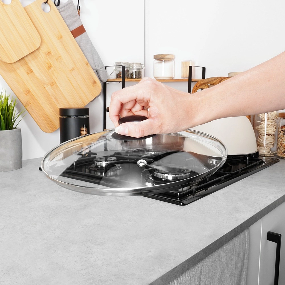 Капакът ускорява варенето и пърженето, ограничава пръските вода и мазнина и помага ястията да останат топли по-дълго. Интегрираният вентил за пара предотвратява прекомерната кондензация и плавно освобождава налягането, а леко изпъкналата форма подпомага циркулацията на горещия въздух за равномерна термична обработка.