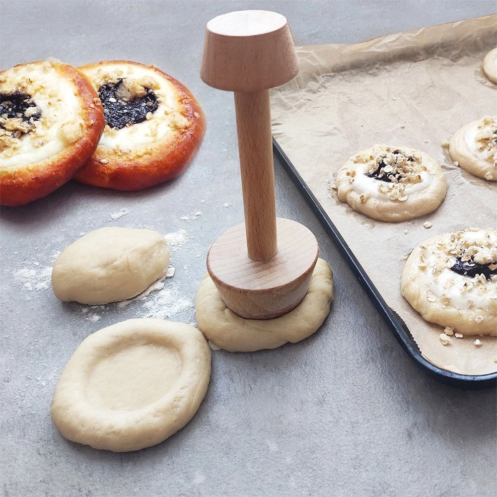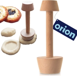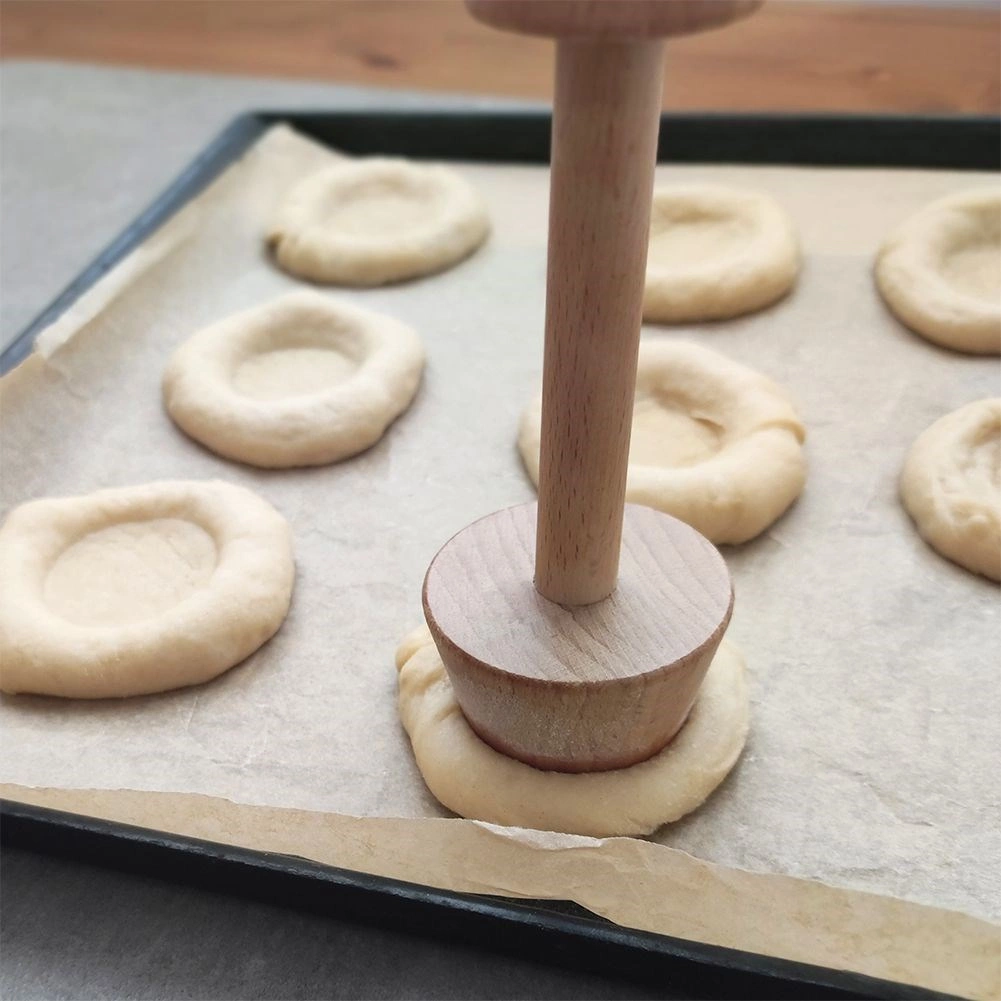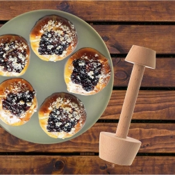 Това двустранно тъпче улеснява приготвянето на тарталети, тарти, бисквити и тестени изделия с втасване. По-малката глава (4 см) е идеална за мини тарталети и кошнички, а по-голямата (5,5 см) – за оформяне на тесто в по-големи форми и за създаване на равномерни вдлъбнатини за плънки като крем, конфитюр, извара или плодове. Благодарение на естествено гладката повърхност от бук тестото не залепва и оформянето е бързо и прецизно.