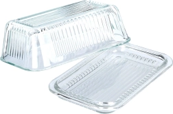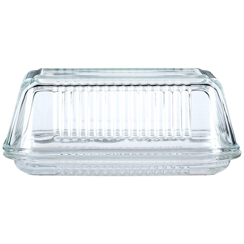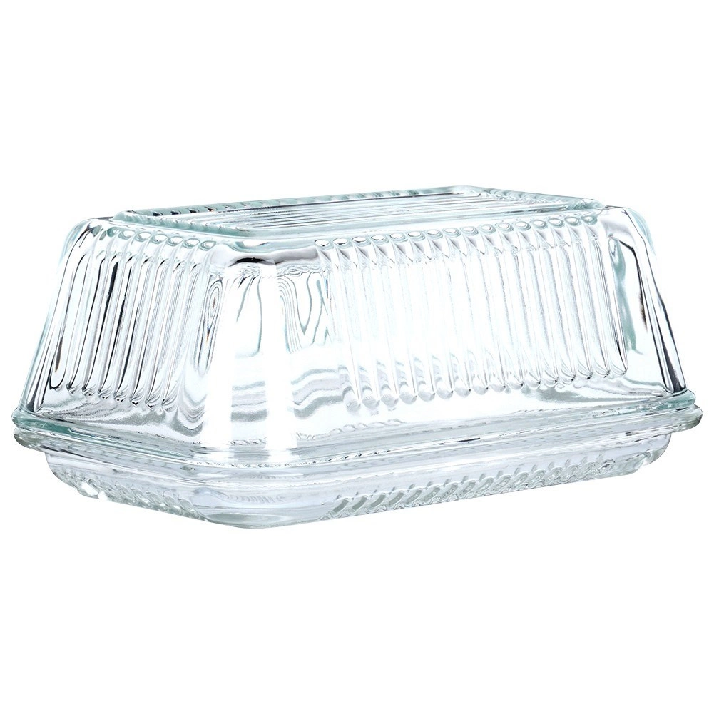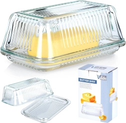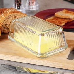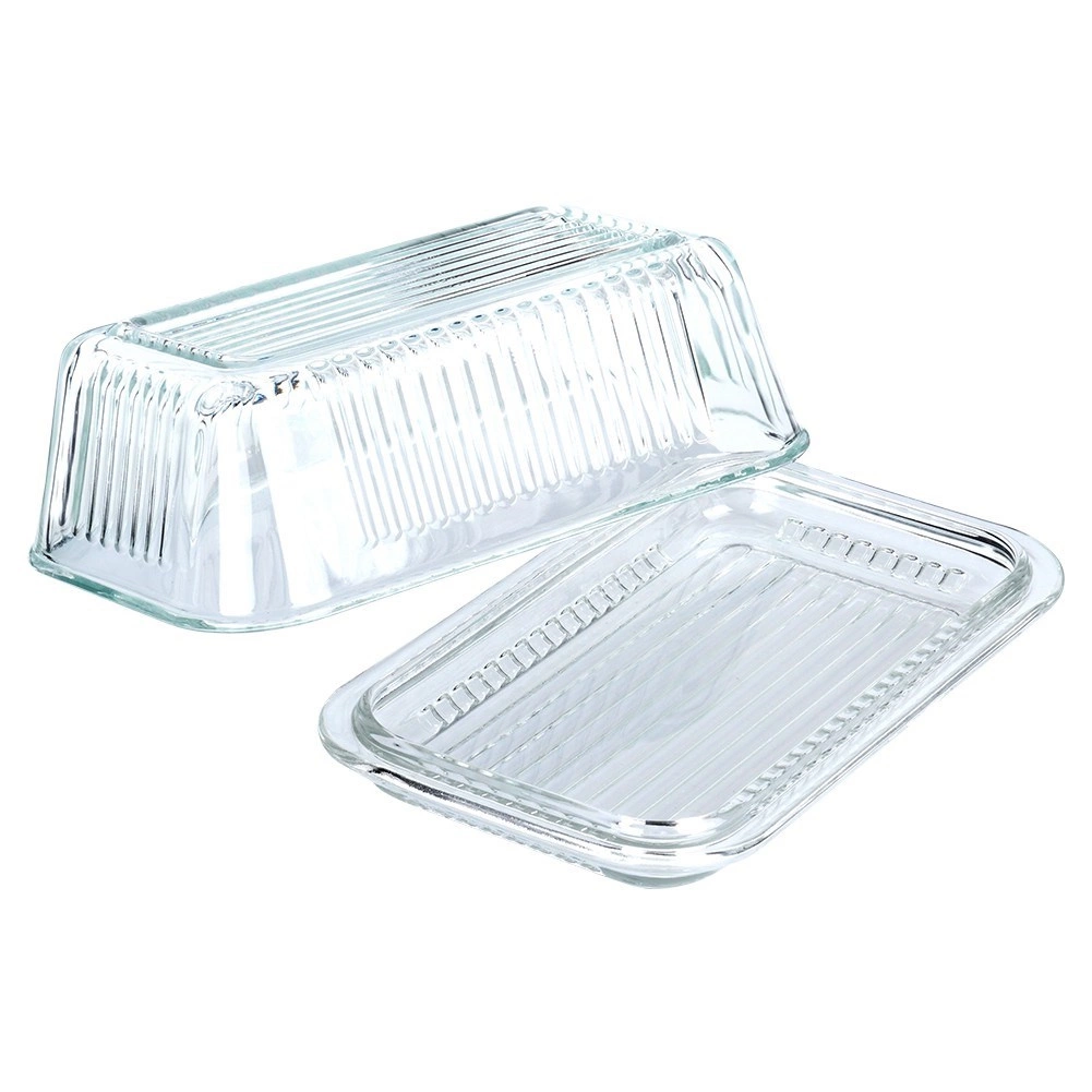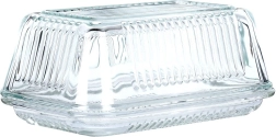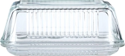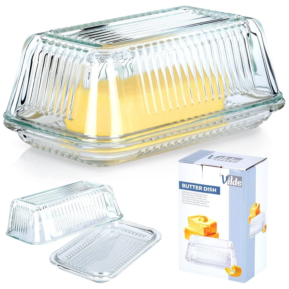 Елегантната стъклена масленица Vilde с класическа форма и рифиран дизайн запазва маслото свежо и красиво поднесено. Изработена е от качествено, дебело прозрачно стъкло, има практично капаче за защита от миризми и замърсявания, а благодарение на прозрачния материал лесно виждате оставащото количество. Подходяща за съдомиялна машина.