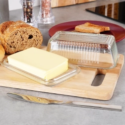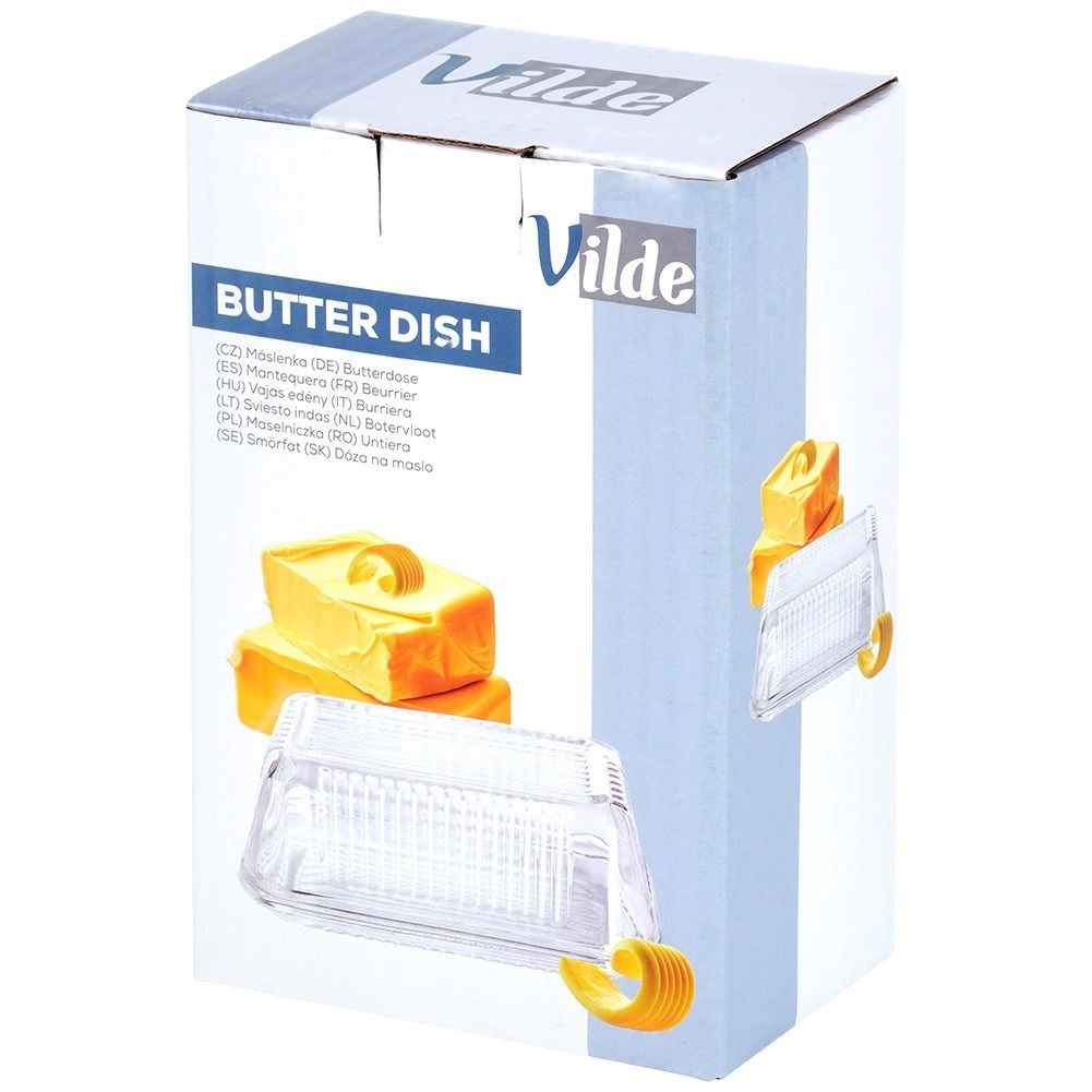 Стъклената масленица Vilde е стилен и практичен аксесоар за всяка кухня. Прозрачното, висококачествено стъкло с декоративно рифеловане подчертава елегантната визия и едновременно улеснява захвата. Класическата правоъгълна форма отлично подхожда на всеки сервиз и позволява удобно сервиране на маслото на масата и подредено съхранение в хладилника.