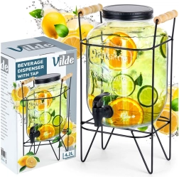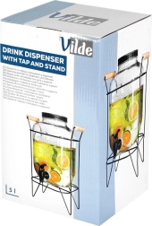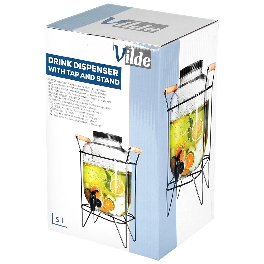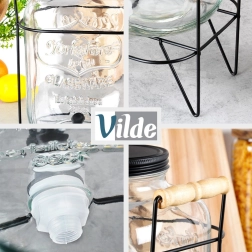 Широкото гърло позволява лесно поставяне на резени цитруси, билки и ледени кубчета. Благодарение на прозрачния стъклен корпус винаги имате видимост върху съдържанието и количеството. Дозаторът не е подходящ за горещи напитки, предназначен е за сервиране на студени и охладени напитки. Оригинален продукт на марката VILDE, произведен в съответствие с европейските стандарти.