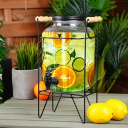 Елегантен стъклен дозатор за напитки с обем 4,2 l със стабилна стойка в цвят розово злато и практично кранче за лесно сервиране. Идеален за лимонади, пуншове, плодови води и студени чайове по време на празненства, барбекю и семейни събирания. Широкото гърло улеснява добавянето на лед и плодове, а винтовият капак предпазва напитката от насекоми.