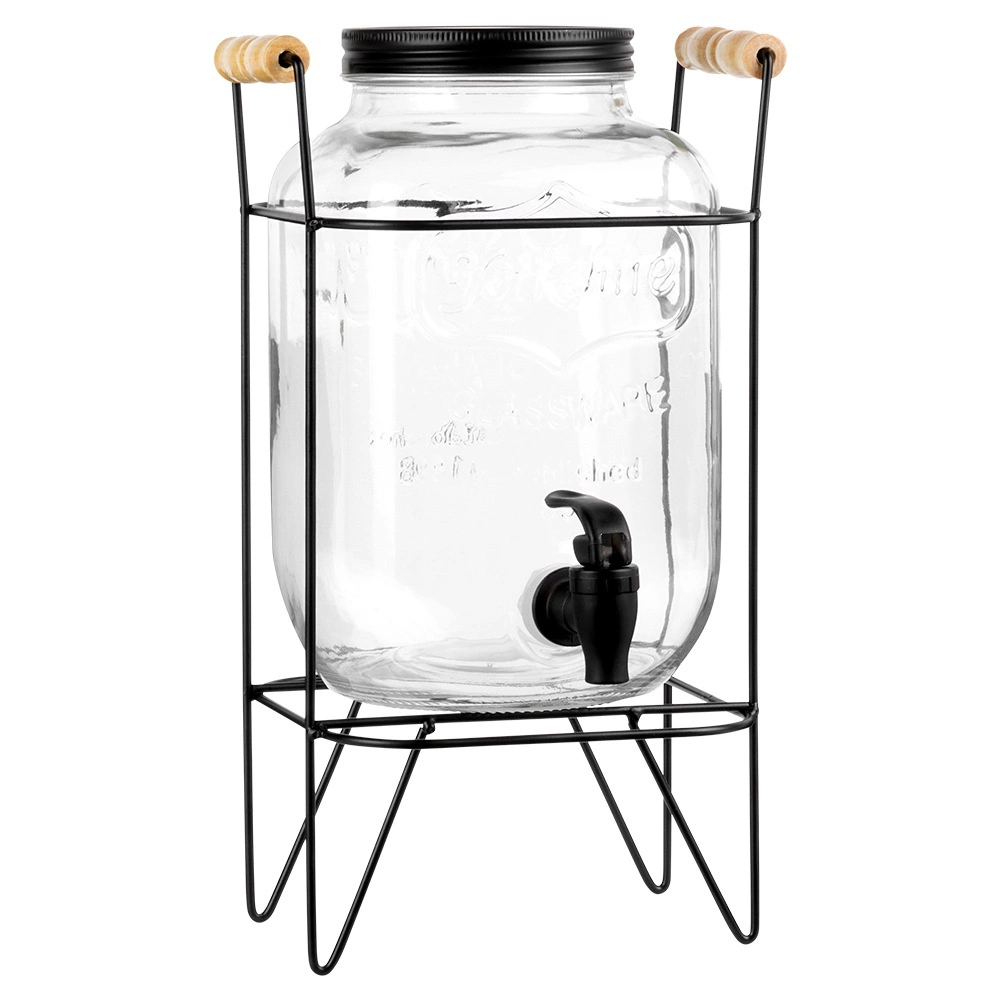 Този стилен дозатор съчетава качествено дебело стъкло с декоративна релефна украса и метална стойка в нюанс розово злато с дървени дръжки. Повдигнатото разположение на съда осигурява удобно наливане в чаши без нужда да премествате съда. Металният винтов капак защитава съдържанието от замърсявания и насекоми, така че дозаторът е перфектен за използване навън и у дома.