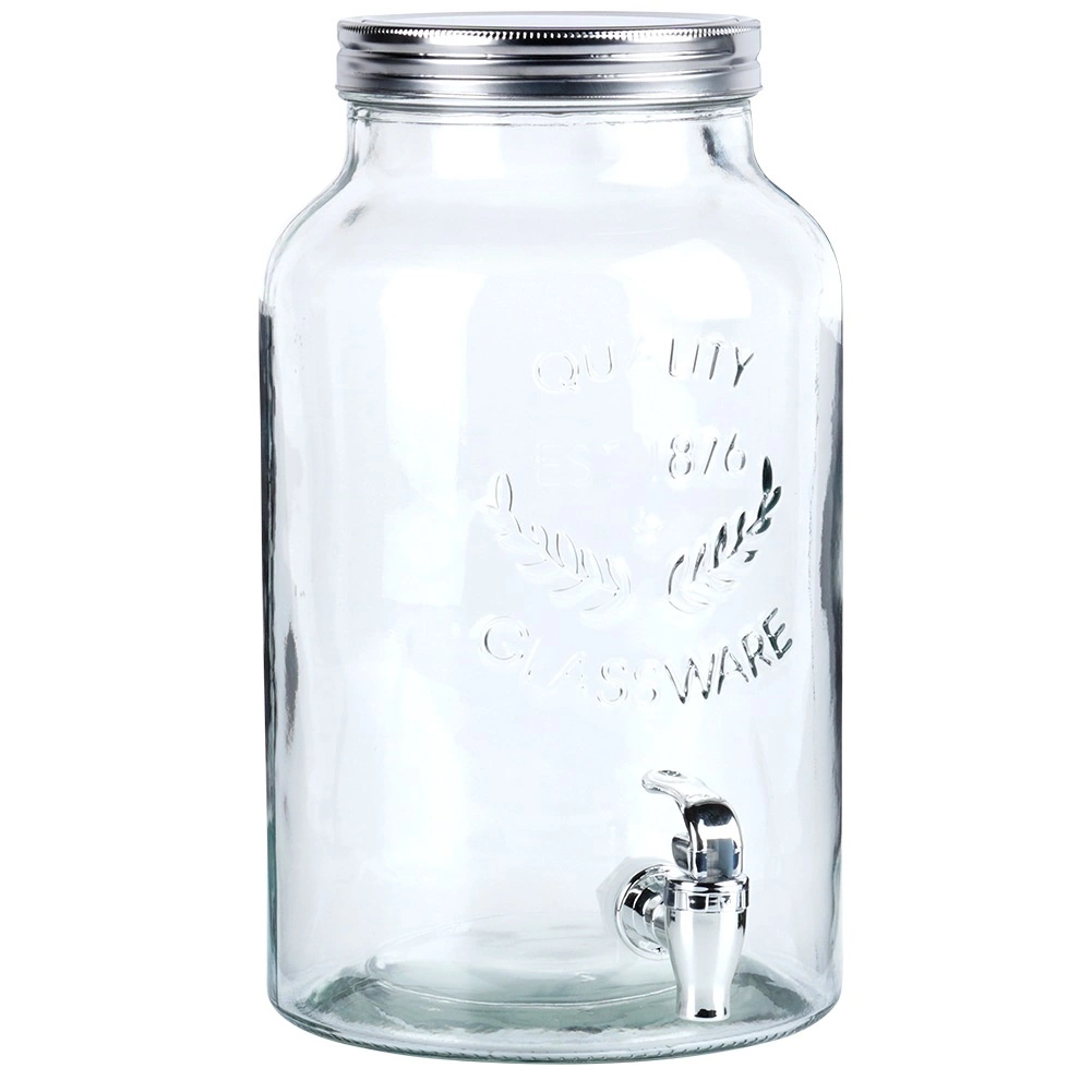 Стилен стъклен диспенсър за напитки с обем 6,2 л с практичен кран и метален винтов капак. Идеален за лимонади, пунш, плодови води и студени чайове. Широкият отвор улеснява пълненето и почистването, релефното стъкло изглежда елегантно, а материалите са безопасни за контакт с храни.
