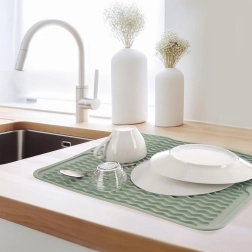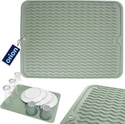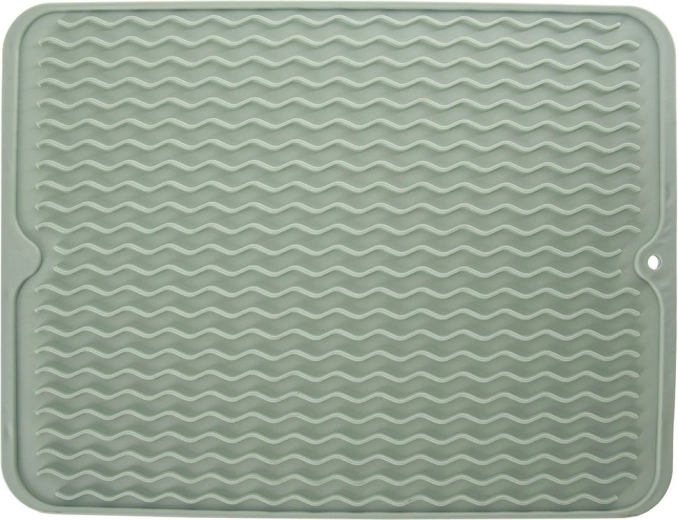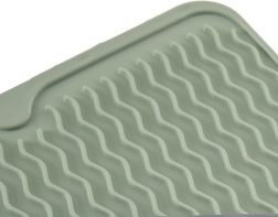 Практична силиконова подложка за отцеждане в зелен цвят с размери 40 × 30,5 см ускорява съхненето на съдовете благодарение на профилираните вълнообразни канали. Тя е гъвкава, неплъзгаща се, лесна за почистване и пести място на кухненския плот. Идеална е за чинии, чаши, халби и прибори и може да се мие в съдомиялна.