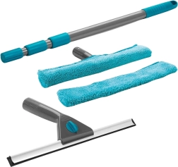 Улеснете почистването на прозорци, витрини, зимни градини и огледала с практичната телескопична миячка със стъргалка. Благодарение на регулираната дължина 57–128 см удобно достигате труднодостъпни места без нужда от стълба. Микрофибърният калъф старателно премахва замърсяванията и отлично попива водата, докато гумената стъргалка оставя повърхността идеално чиста и без следи.
