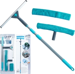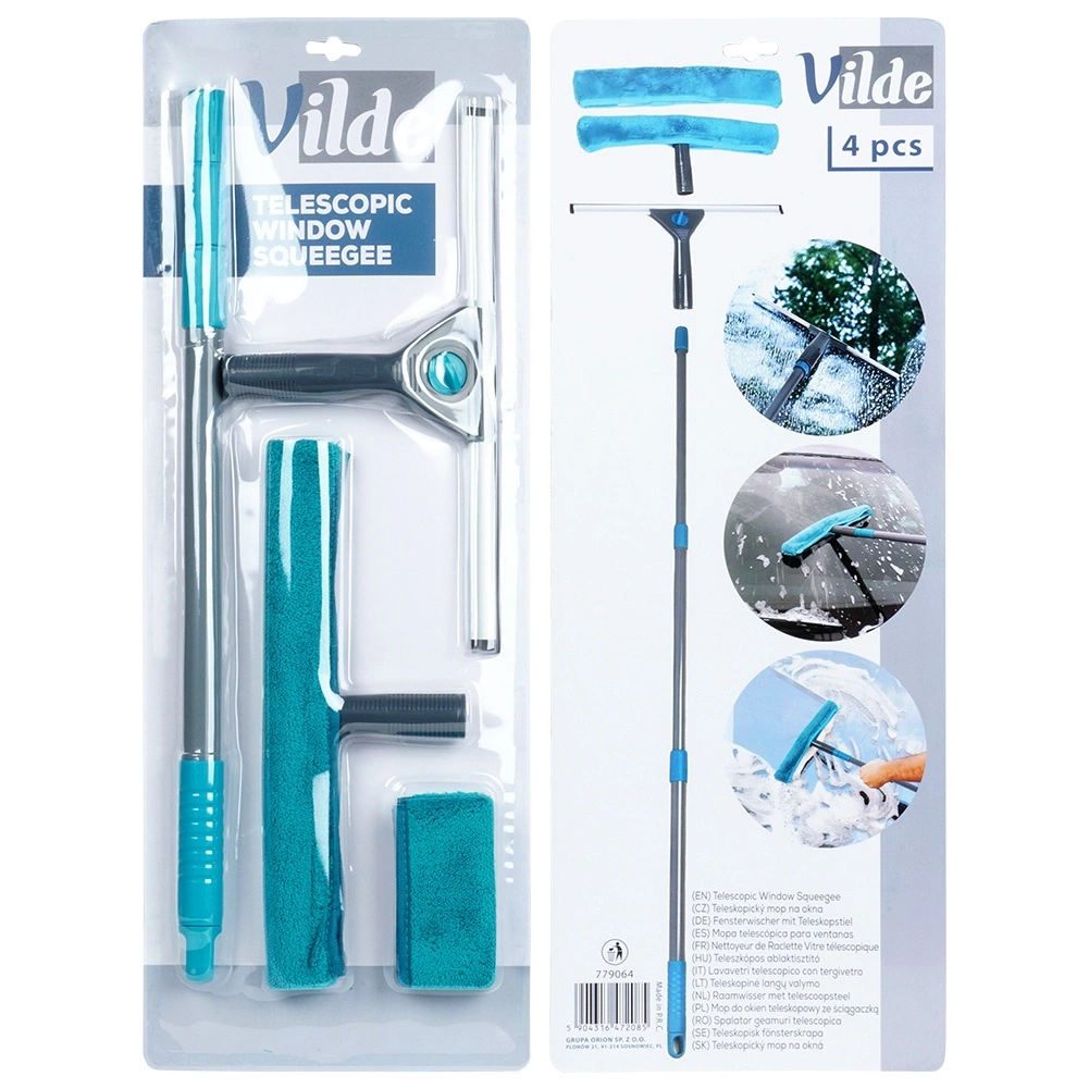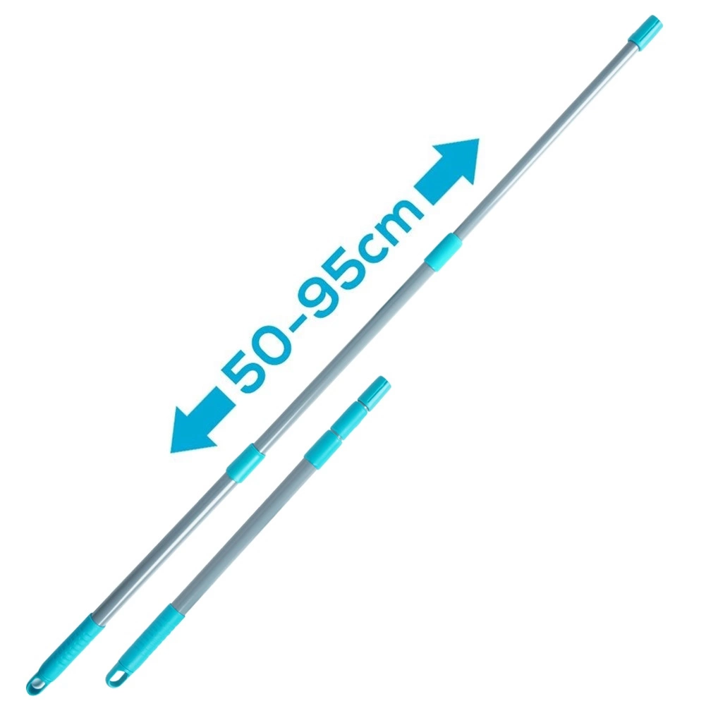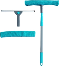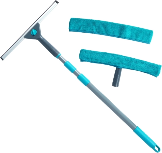 Комплектът съдържа всичко необходимо: телескопична дръжка, миеща глава с микрофибър, стъргалка и резервен калъф. Калъфите се перат в пералня и се използват многократно. Металната дръжка в сиво с издръжливи пластмасови елементи в тюркоаз е лека, но здрава, а в края има отвор за окачване за компактно съхранение.