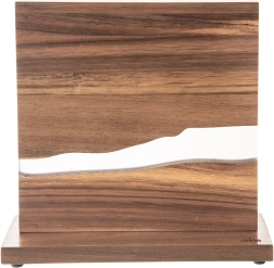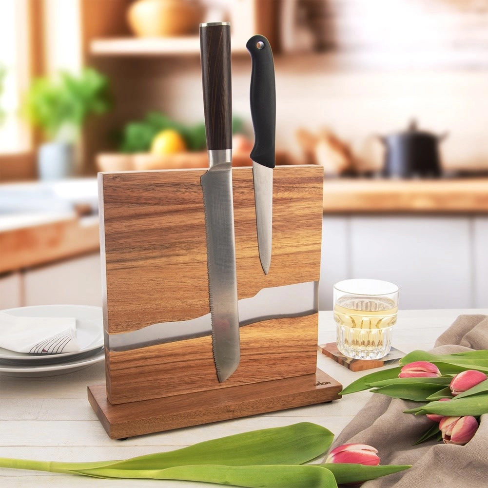 Елегантна двустранна поставка за ножове от естествено акациево дърво с декоративна смола в стил „река“ предлага силна магнитна повърхност, сигурно и подредено съхранение на ножове и ножички и модерен дизайн, подходящ за всяка кухня. Благодарение на двустранното подреждане спестява място на плота, а филцовите подложки на основата защитават работната повърхност от надраскване.