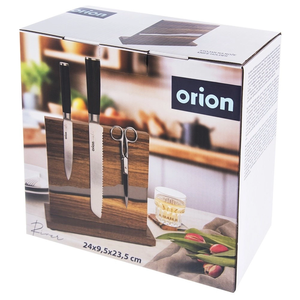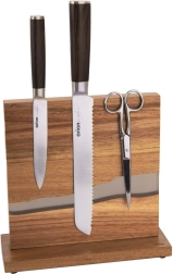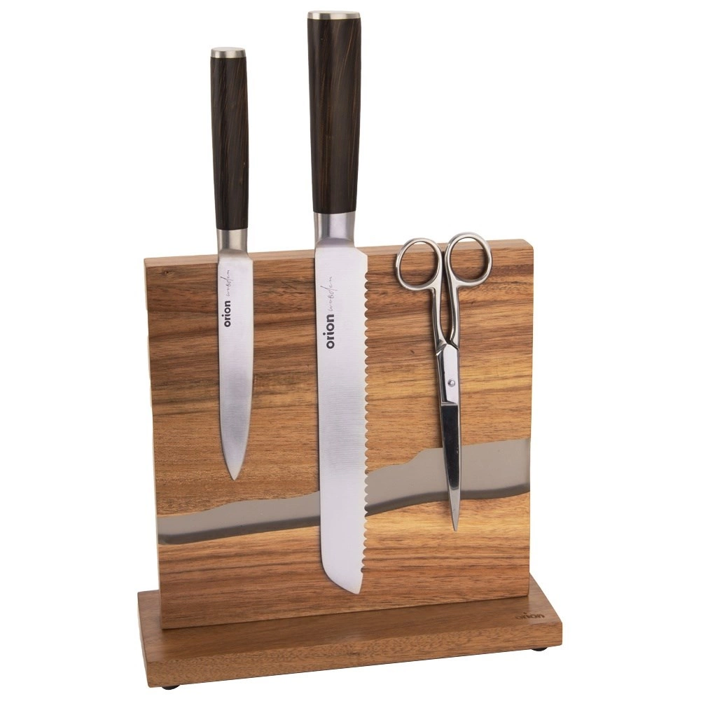 Поставката River комбинира естествената красота на акациевото дърво с оригинална смолна инкрустация, напомняща течението на река. Магнитната повърхност от двете страни позволява закрепване на ножове и метални кухненски принадлежности без вкарване в прорези – остриетата са винаги видими и под ръка. Стабилната основа с филцови крачета стои здраво на място и едновременно защитава работния плот.