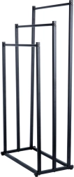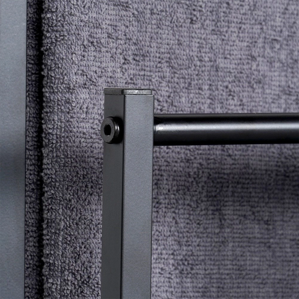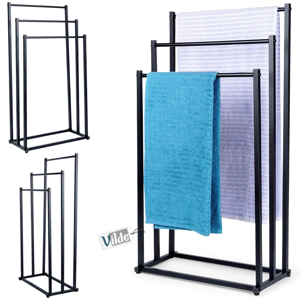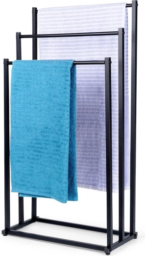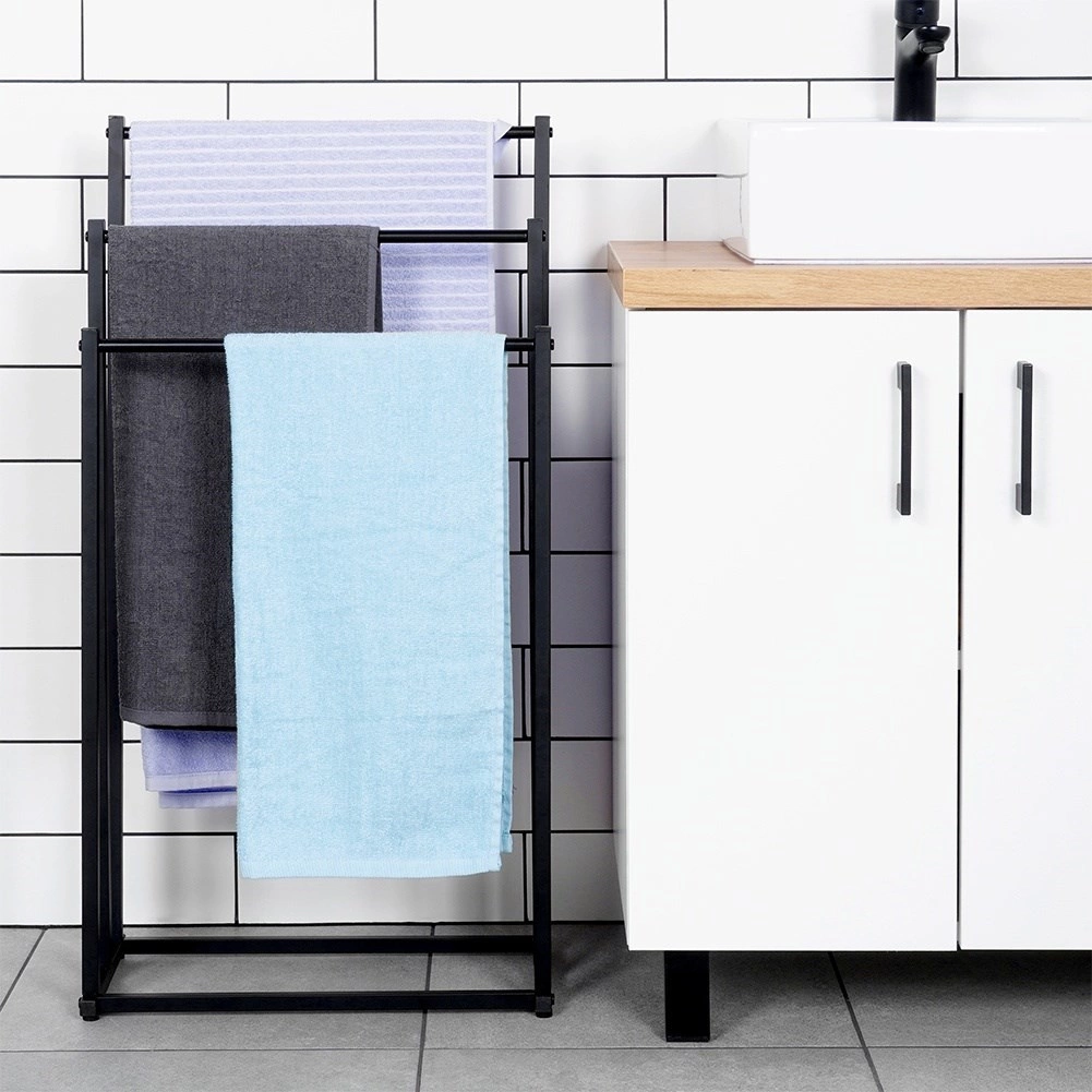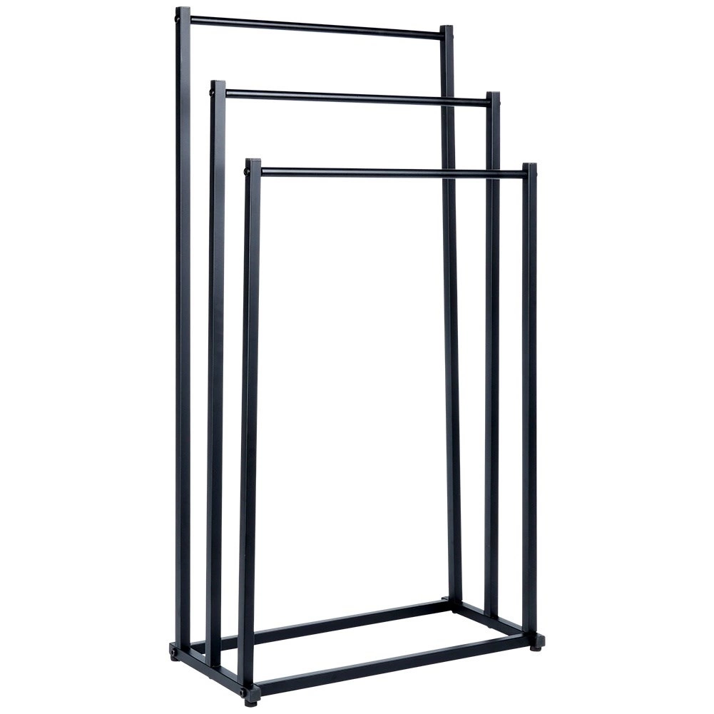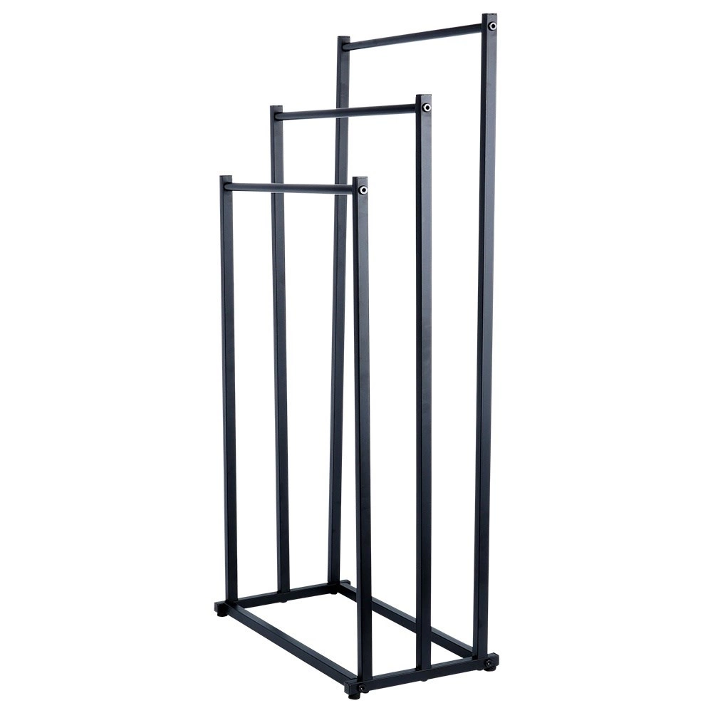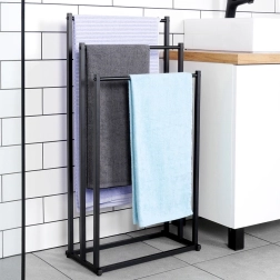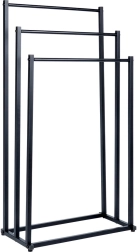 Практична свободно стояща стойка за кърпи или дрехи с три стъпаловидно разположени шини осигурява подредено съхранение и по-добра циркулация на въздуха за по-бързо изсъхване. Минималистичният вид в матово черно се съчетава отлично със съвременни интериори и придава индустриален характер на банята.