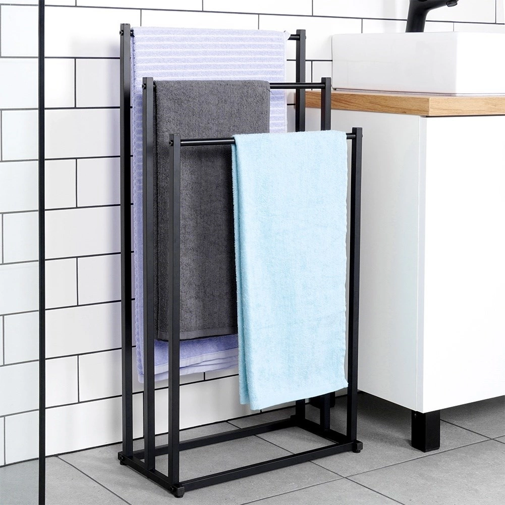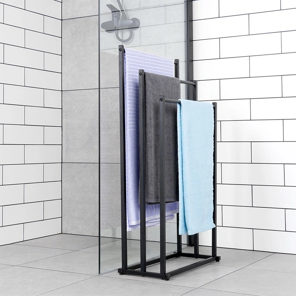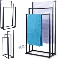 Елегантен стоящ държач за кърпи с тройни напречни шини, който осигурява бързо съхнене, икономия на място и стабилна метална конструкция с прахово боядисване в черно. Идеален за модерни и класически бани, лесен монтаж и стилен лофт дизайн.